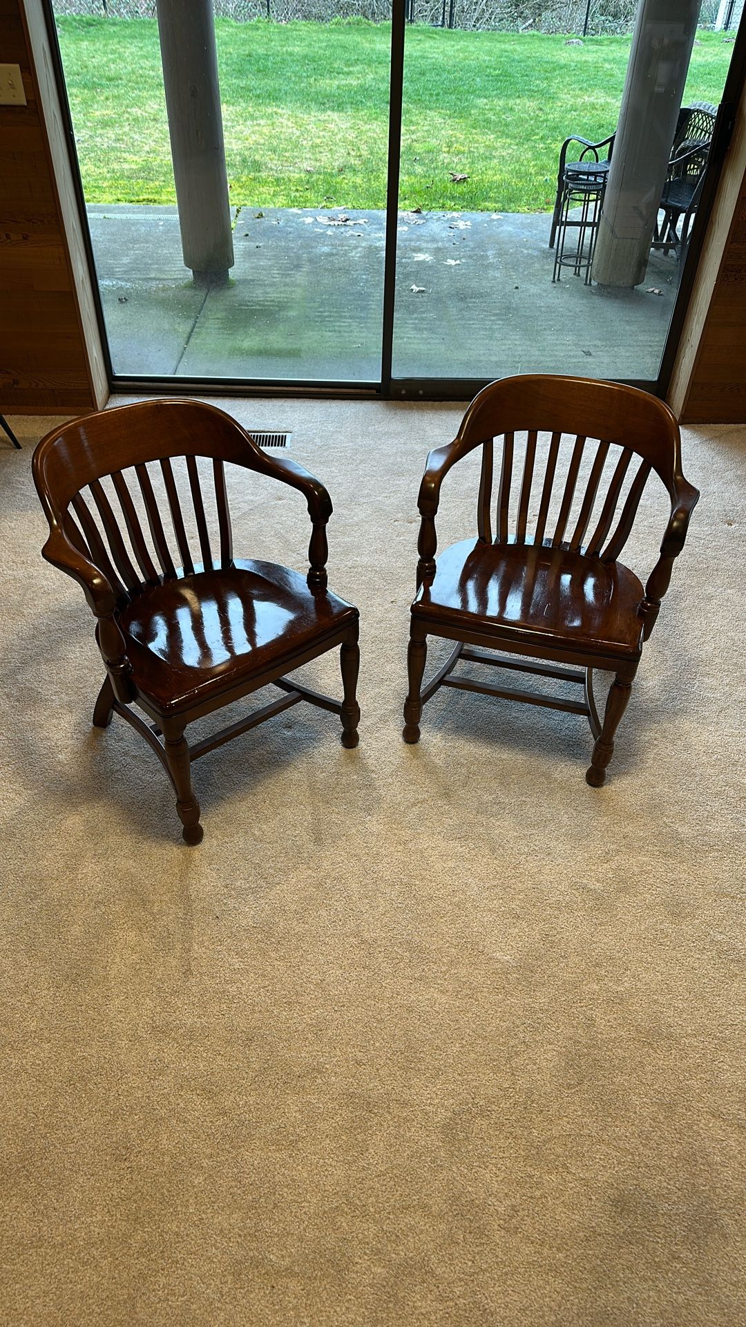 I collected bankers chairs for my office at one point and these chairs are the best by far. They are Sikes company banker chairs from Buffalo NY and it is somewhat hard for me to part with them because of the craftsmanship put into them. A pair of these exact chairs list between $600 - $1,000 for reference. Very sturdy and something you can have for a lifetime and pass down through generations. Beautiful chairs!