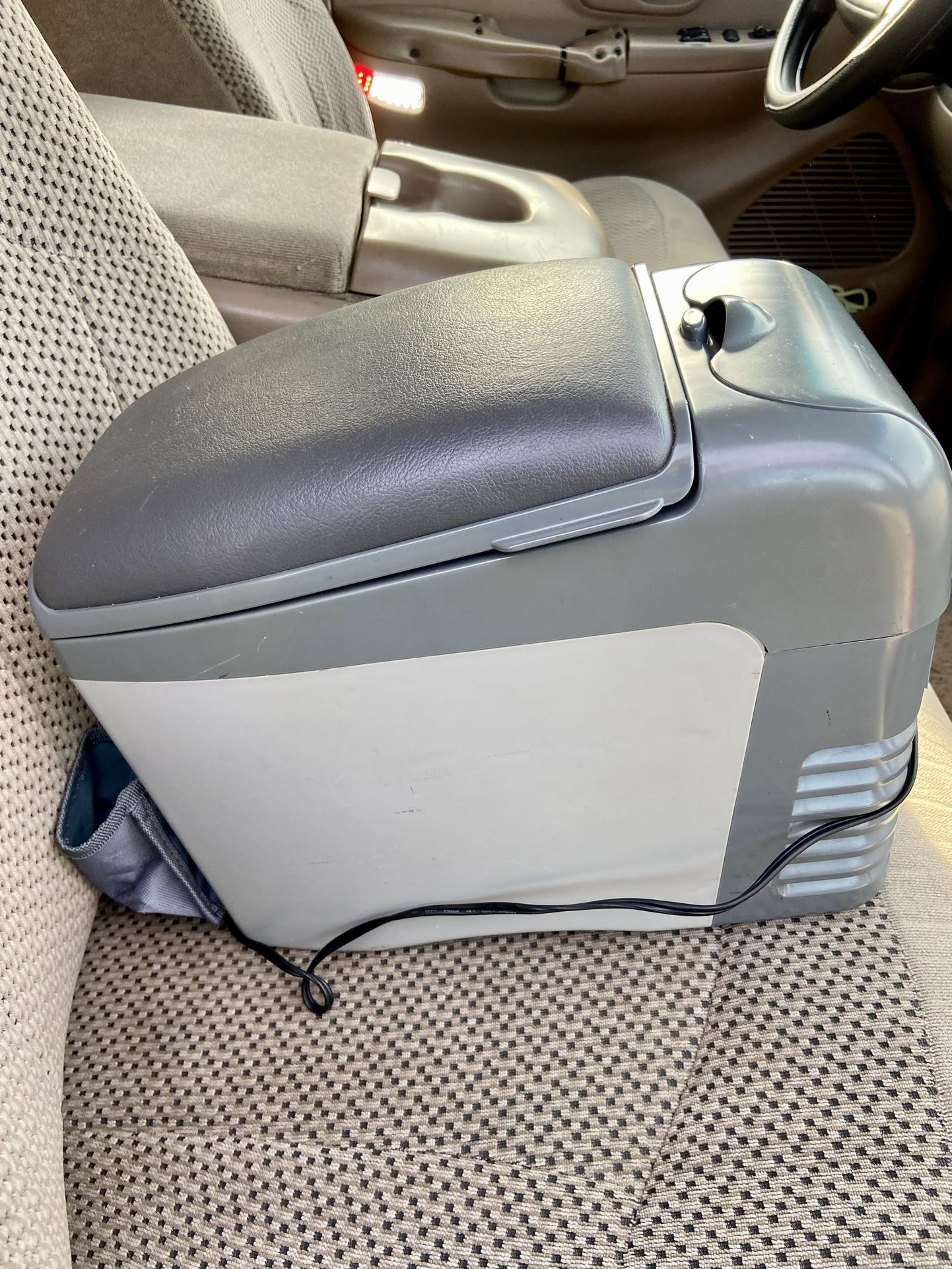 Vintage JOHNLITE TRAVELCar JML 3809 HOT COLD COOLER / WARMER DC 12V w/ CUP HOLDERS for Truck, Car, SUV, or Camping Travel Cooler Cold / Warm Gray Portable & Compact 12V DC Plug 60W 4.8Amp Low of 30° High 115° OD14x11x7.5" Padded Top / Armrest, Drink Holders, Pockets Fits a 6-Pack + More. Everything works great
