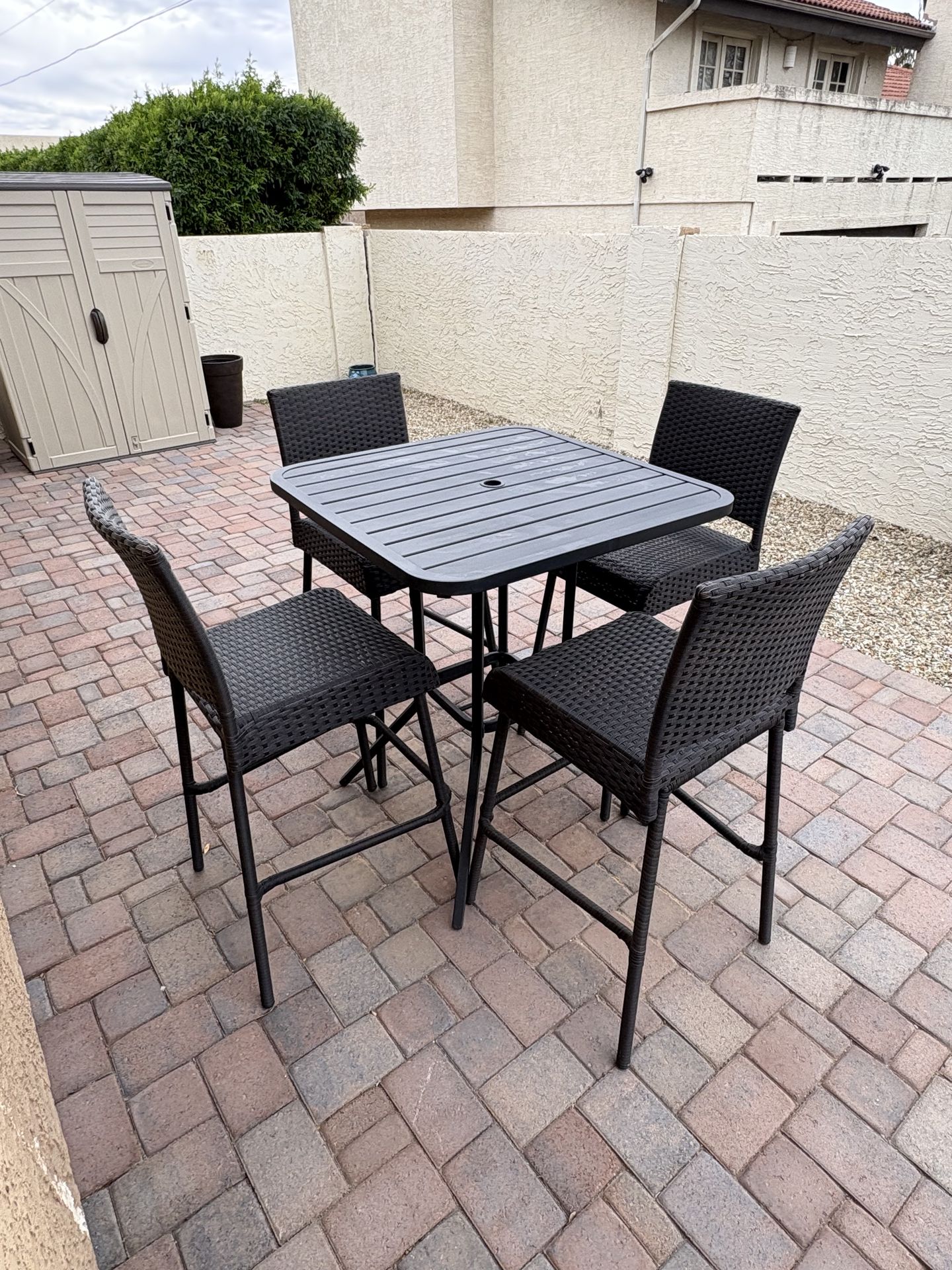 Table- black metal, length: 33”, width 33”, height: 39” Chairs: 4, wicker, width: 17”, height: 43”