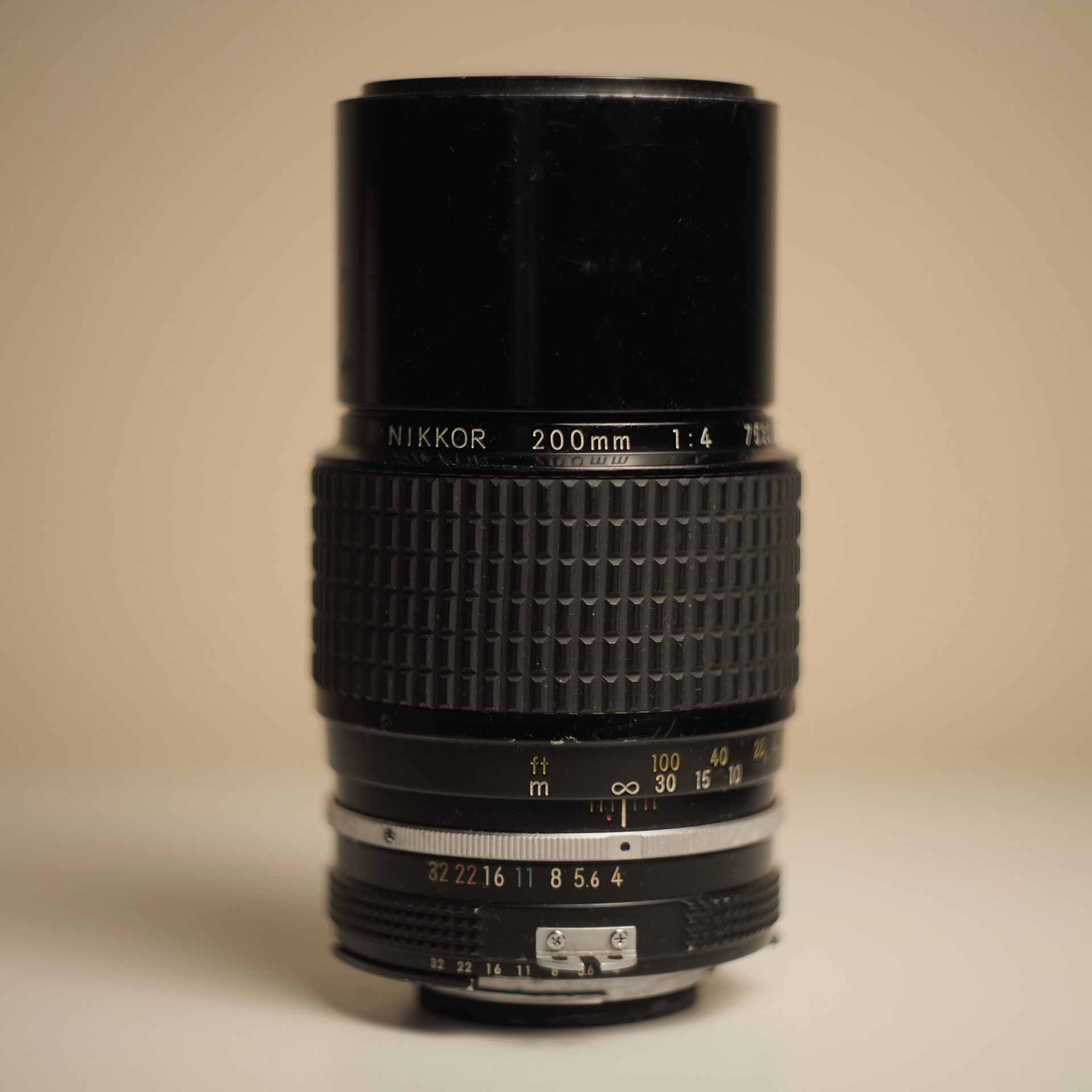 Nikon 200mm f/4 film era camera lens! It is Nikon F mount but is easily adaptable to modern mirrorless cameras. (Sony, Canon, Nikon, Panasonic, Fujifilm, Blackmagic, Leica, Sigma, Olympus, etc.) It has a built in retractable hood. All metal build. The glass was just cleaned. Send me a message for more pictures or information!