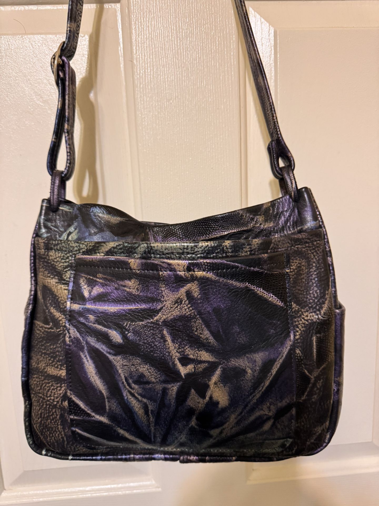 Lovely vintage Metalic Multi -Colored Brush Stroke Abstract Purse/Handbag. You will love the vibrant colors and squeeze soft leather. This bag has many outside pockets. Two front pockets, one side pocket and one large back pocket. One inside zipper with a raw unlined leather lining . This bag reminds me of another famous vintage 60’s guardian Puppies 70s 80s 90s 2K and beyond that are still making bags that have recently become popular again. Pick up in the southwest area near Durango and Russell Road