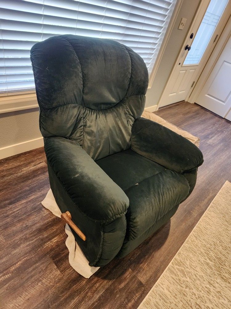 Beautiful green lazy boy recliner. It is in need of some more stuffing/cushion and a better upholstery fix then I was able to manage. Honestly just want to see it go to a good home so please shoot me your offer. Comes from a dog filled but smoke free home.