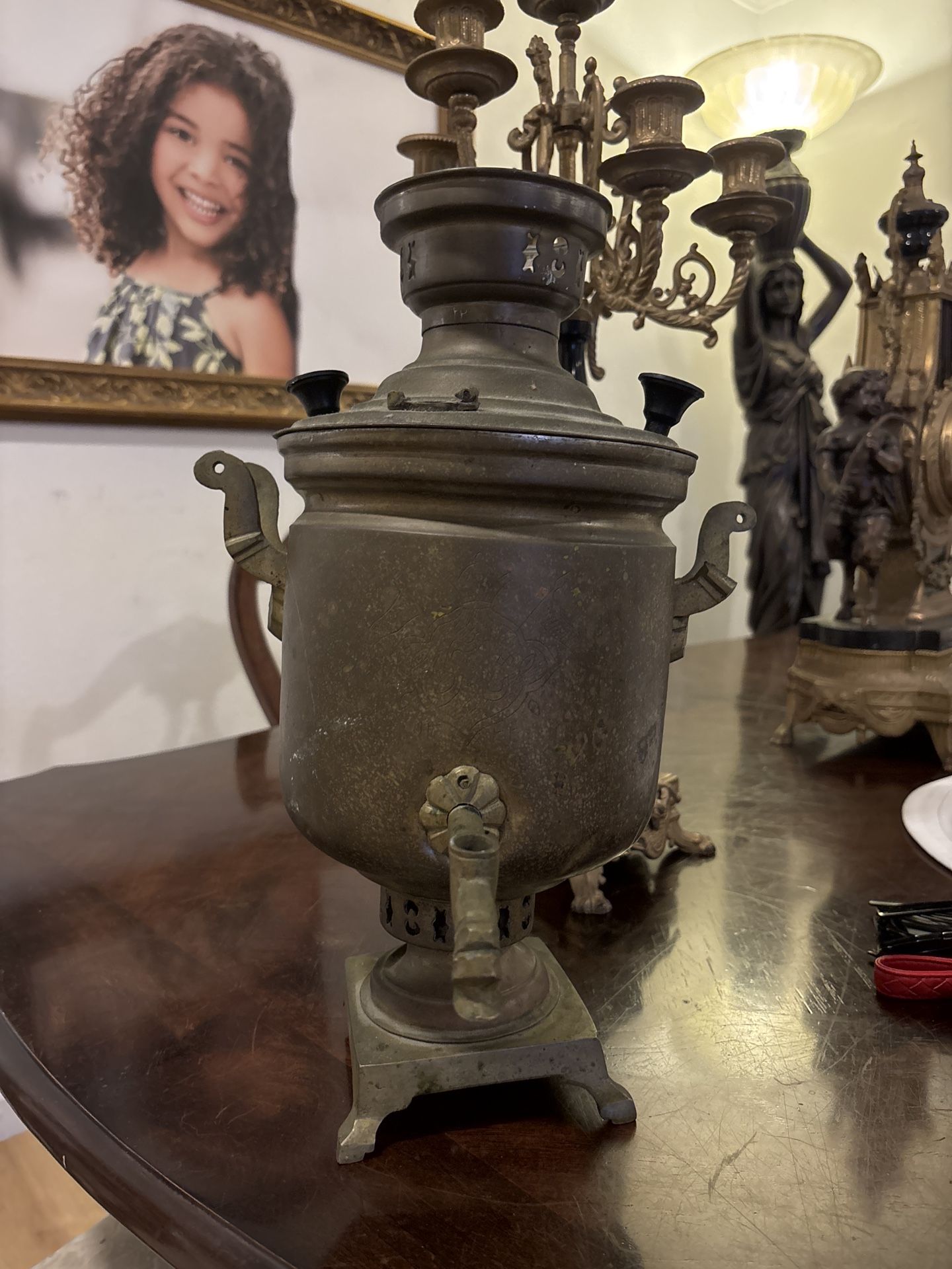 Authentic antique brass samovar, likely of Russian origin (possibly Tula), dating from the late 19th to early 20th century. This beautiful piece features original handles, spout, and classic old-world design. It has a rich aged patina and is perfect for collectors or as a unique decorative statement. 🗝️ Key Features: • Solid brass construction with ornate details • Original spout and handles intact • Unique patina from natural aging • Measures approximately: [add measurements] • Great addition to a vintage or antique collection 📌 Condition (Updated): • Structurally solid • Original parts present (handles, spout, lid) • Shows visible signs of age and tarnish • Some oxidation, small spots, and wear consistent with antique status • Could be polished if desired, but retains a desirable antique look