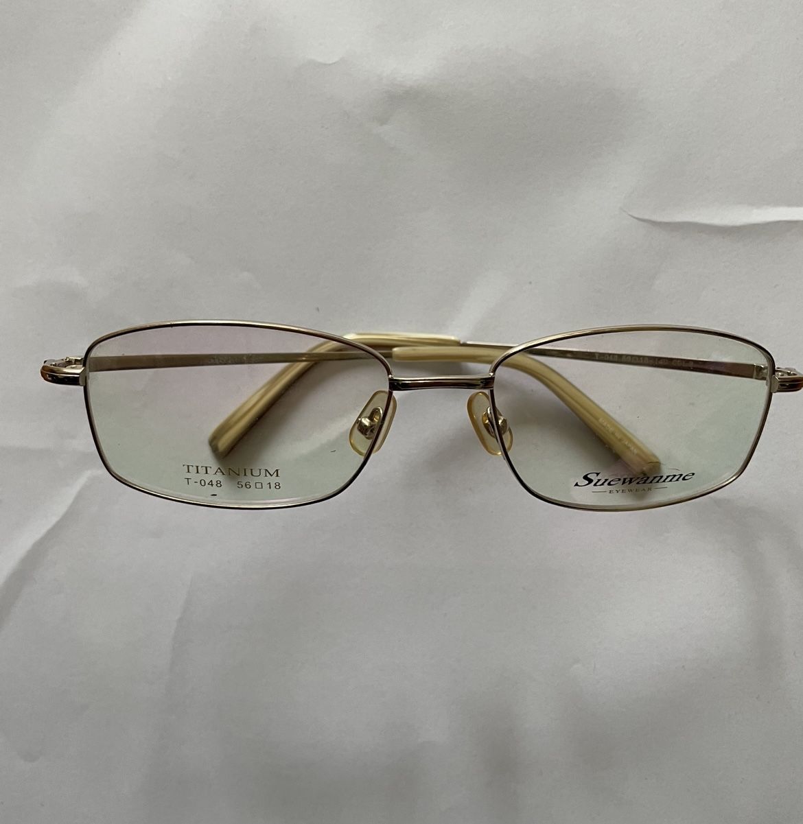 It is a pair of glasses frames of the brand "Suewanme" (Shu Wan Mei). • Model: T-048 • Material: TITANIUM (Titanium metal). This material is characterized by its light weight, high strength, corrosion resistance, and low risk of causing skin allergies. • Color code: COL.2 (usually representing gold or champagne gold) 2. Size details The numbers 56 □ 18 - 140 on the frame represent the size of this pair of glasses (usually measured in millimeters): • 56: Lens width • 18: Nose bridge width (middle bridge width) • 140: Frame length 3. Design features • Frame type: It belongs to a relatively classic full-frame rectangular design, with a style leaning towards business or stable type. • Origin: The "MADE IN JAPAN"字样 on the lenses indicates that the brand or the series might be Japanese-made, and usually the craftsmanship is more refined. Summary This is a pair of high-quality titanium metal myopia frame glasses. The current lenses are printed with the brand logo, indicating that this is a flat lens for display purposes. If you plan to wear them, you need to go to a glasses store to have the lenses with the prescribed power reprocessed.