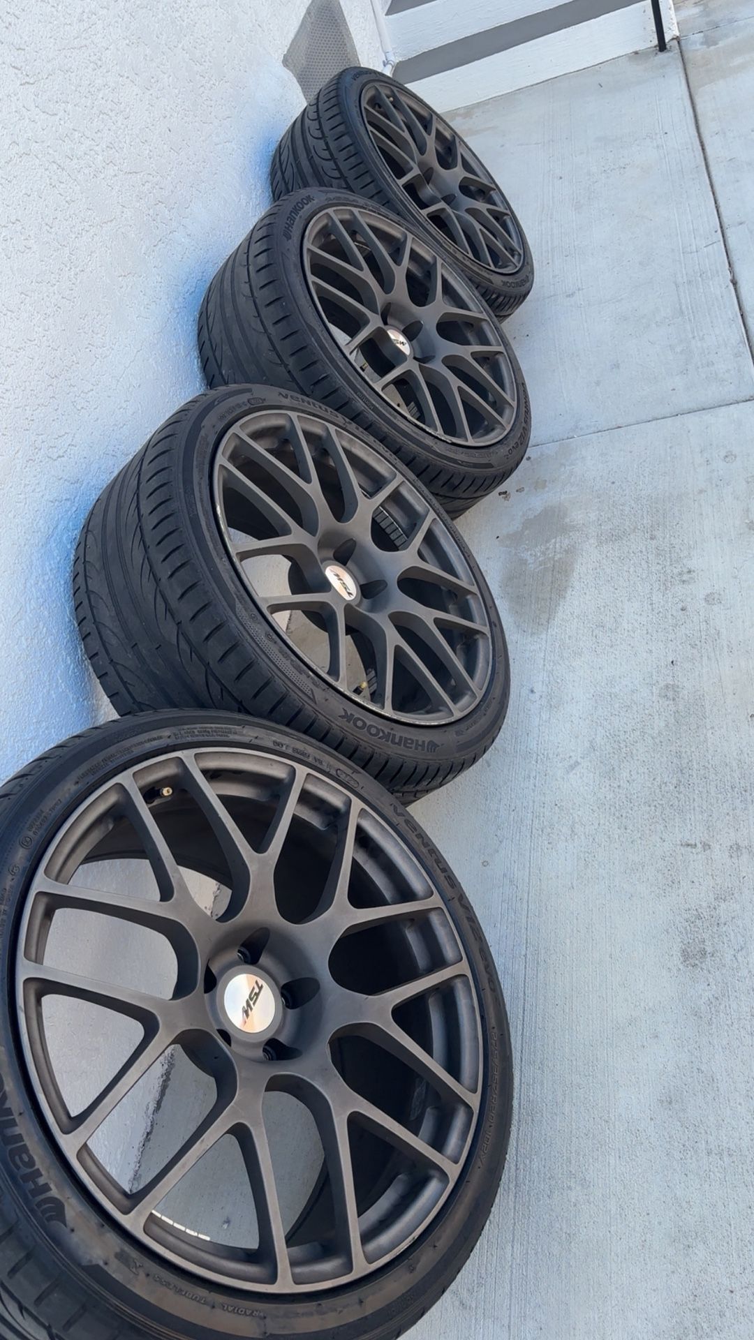 Tire size- 275/35/20 Bolt pattern- 5x4.5 inch (114.3 mm) Front tire life- good Rear tire life- low Last 3 pictures are some damages they come with. Tires have been rotated and topped off with air ready to go. Any question let me know.