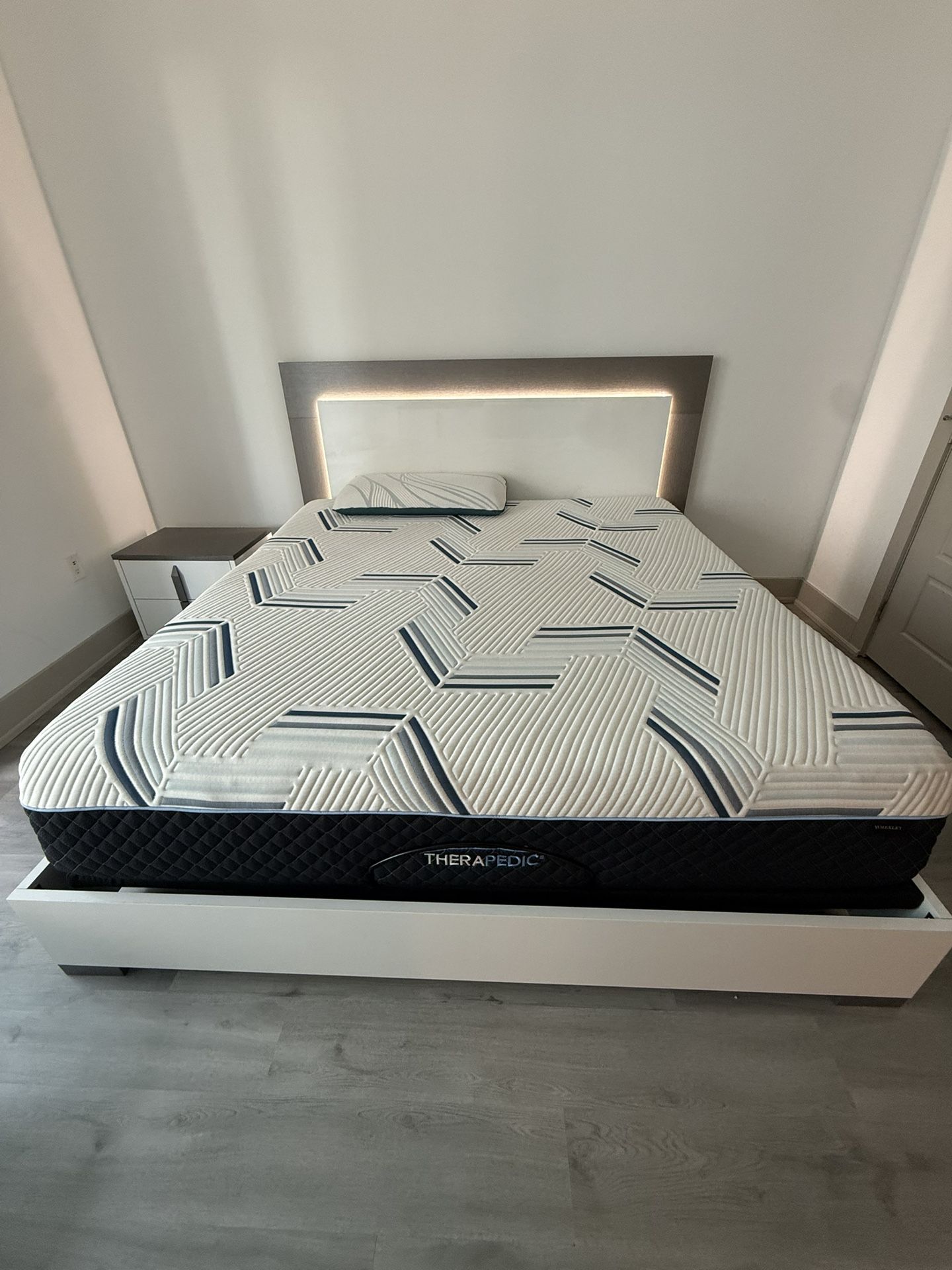 Description: Selling a modern bedroom set in excellent condition, very well maintained and lightly used. Includes: ✔️ Bed frame with modern LED headboard ✔️ Dresser ✔️ Nightstand ✔️ THERAPEDIC mattress included (optional) White finish with gray/wood accents, contemporary style. Clean, no stains, no damage, smoke-free home. 📍 Local pickup only 💵 Price negotiable ❌ No delivery Message me if interested.