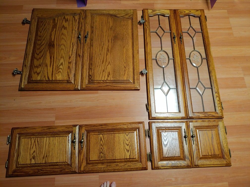 Amish made solid oak & leaded glass paired cabinet doors including stainless steel knobs & concealed soft close hinges in like new condition. Asking $50.00 or reasonable offer for entire lot. Open to trades.