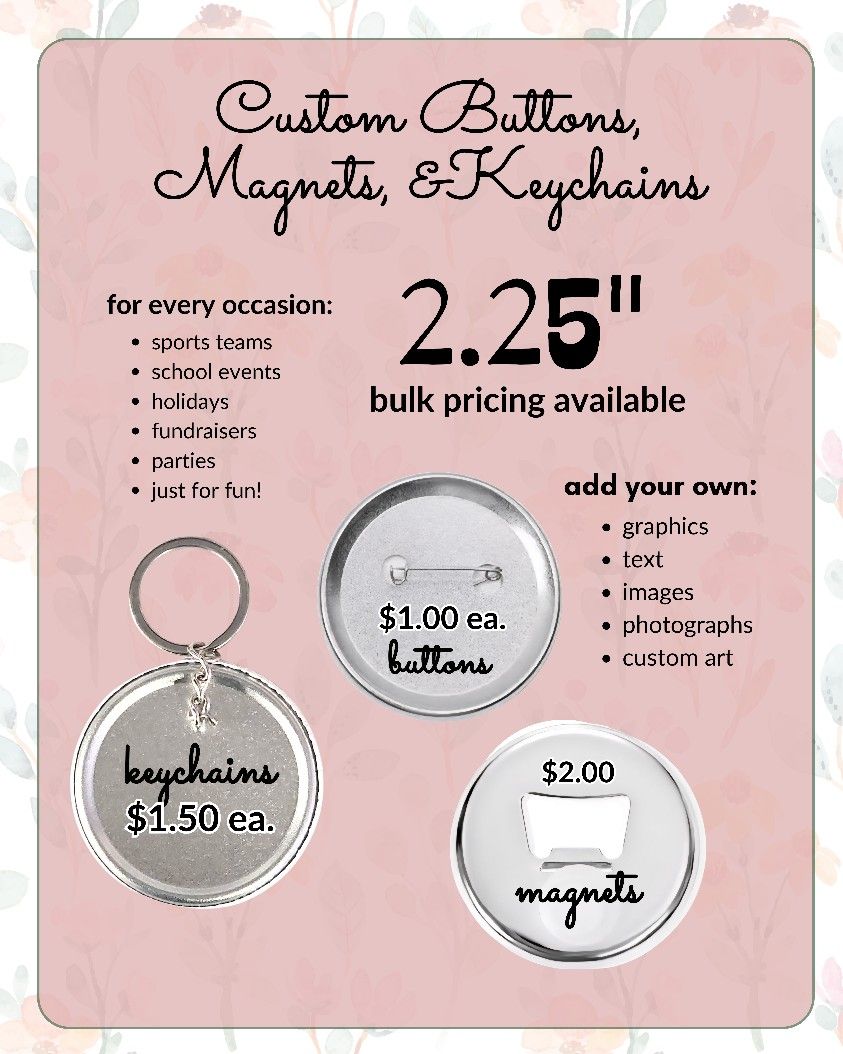Bring your ideas to life with high-quality 2.25" custom buttons, magnets, & keychains – perfect for sports teams, school events, fundraisers, holidays, parties, or just fun personal swag! Buttons: $1.00 each Keychains: $1.50 each Magnets: $2.00 each Bulk pricing available for bigger orders! Fast turnaround using premium photo paper for vibrant, long-lasting results. Add your own graphics, text, images, photos, or custom art. Local delivery available in the Wildomar area.