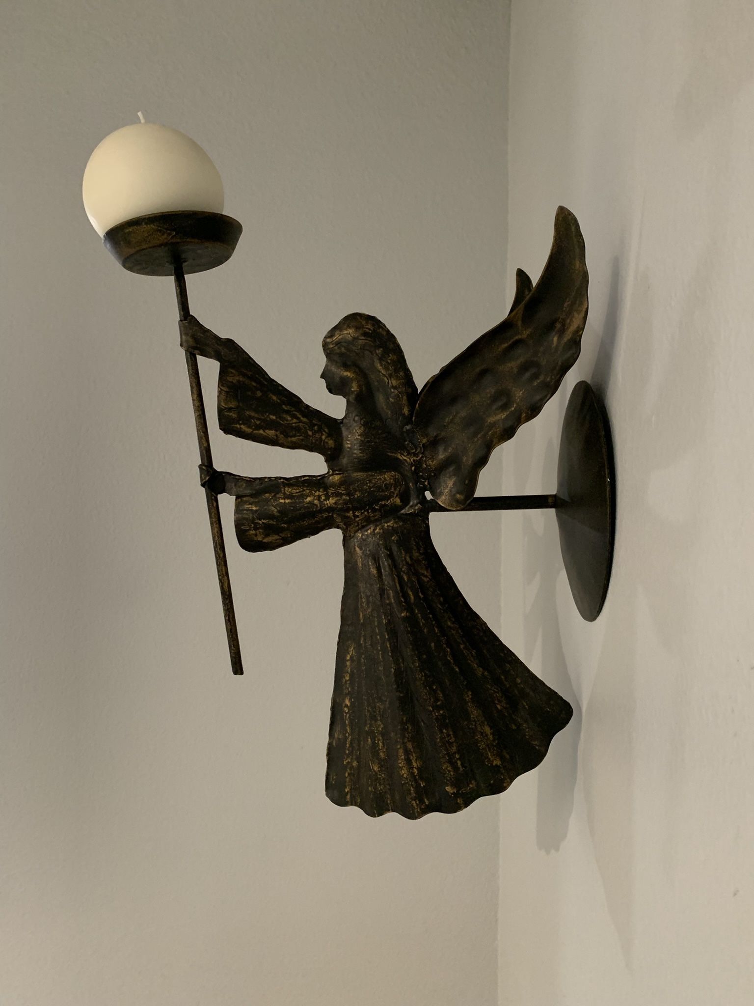 Beautiful candle holder with nice patina. Attaches to the wall. Approximately 17.5” x 11”