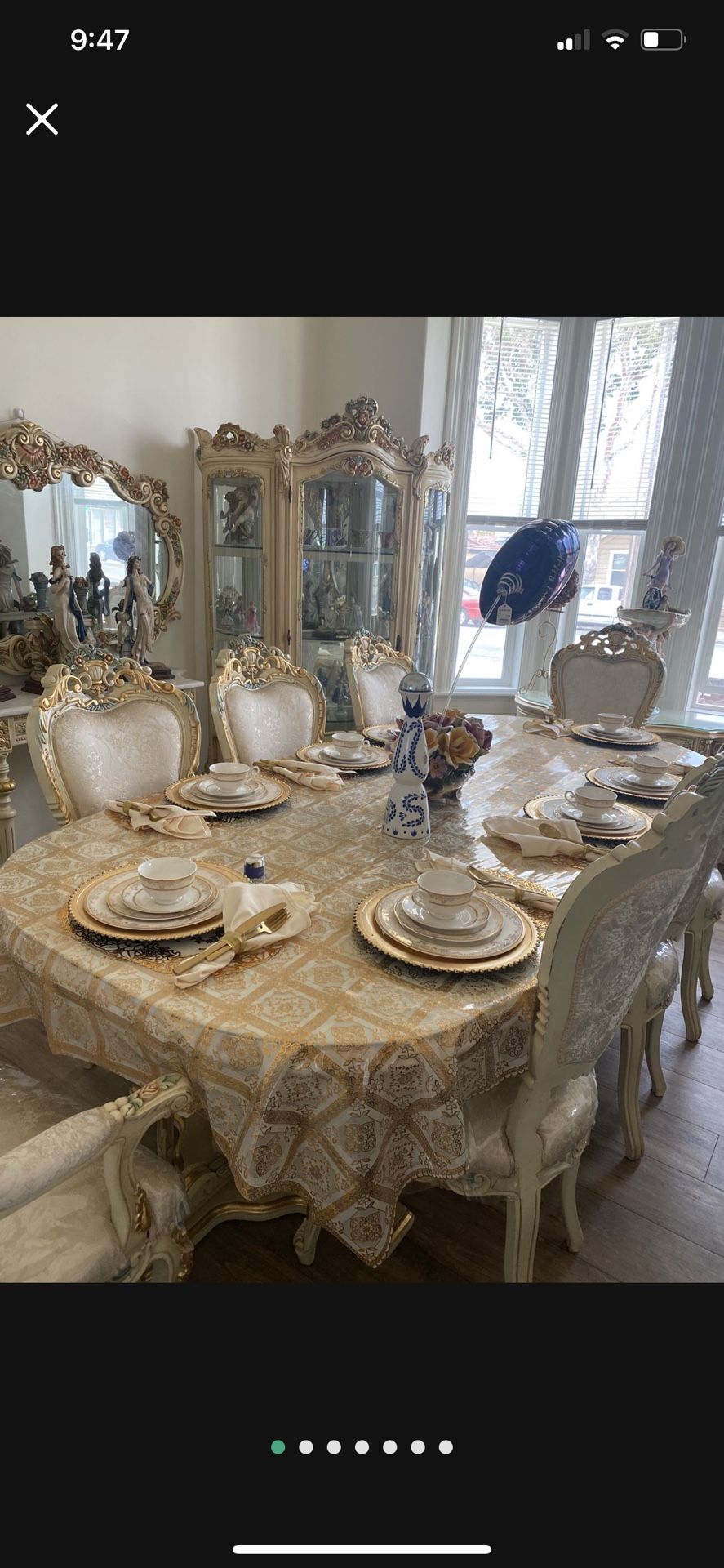 Dining room table seats 8/2 a glass top to protect table table is in great condition I have to Hutch Two side tables one Buffay table Very beautiful furniture very elegant hardly use please serious buyers only 3000