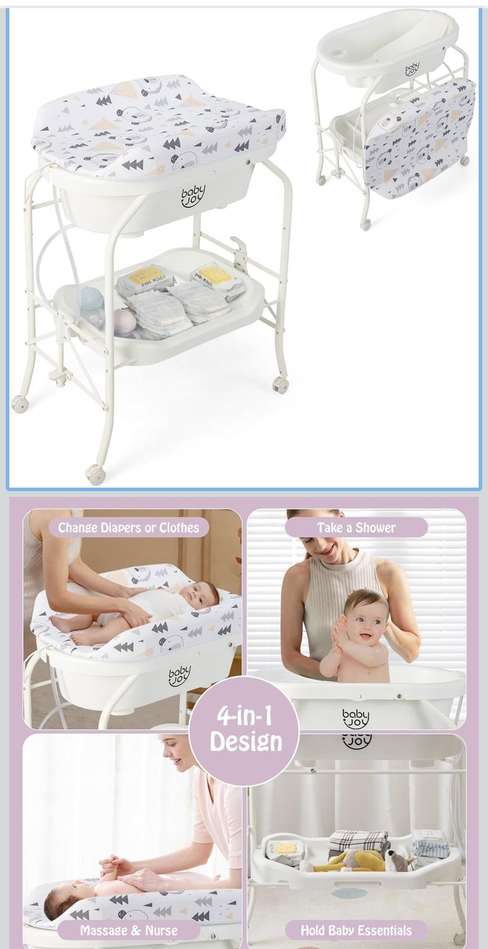 BABY JOY Baby Bathtub with Changing Table, Foldable Infant Diaper Changing Station with Storage Tray, Waterproof Pad, Portable Newborn Nursery Organiz