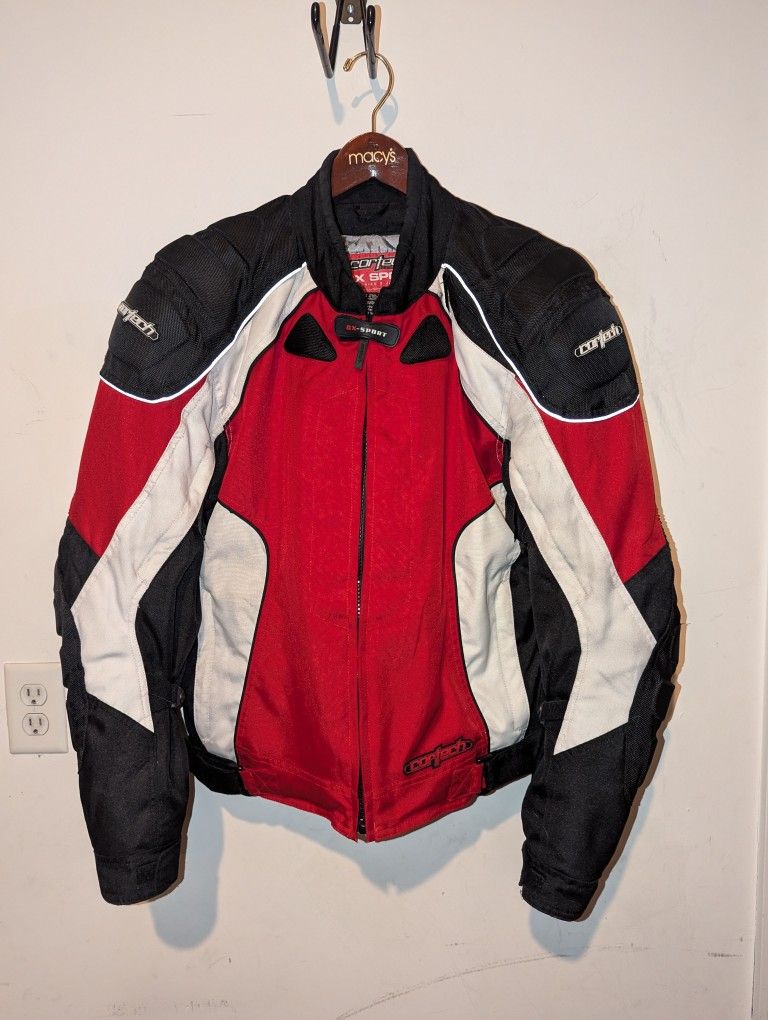 Car Tech red, white, and black motorcycle jacket with armor in elbows, shoulders, and back. Comes with a removable liner for warmer days.