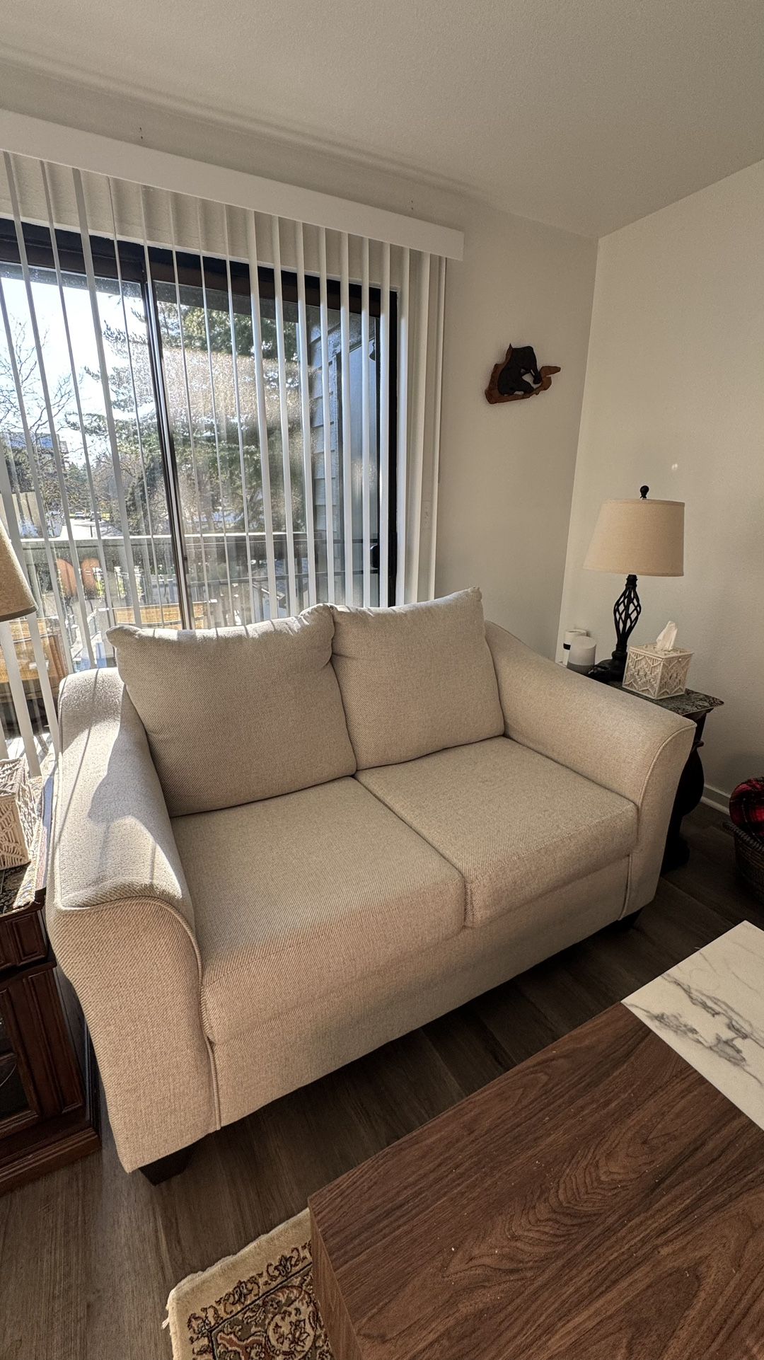 Selling my beautiful beige loveseat in great condition. No stains, no smells, no pets, no smoke. The fabric is a neutral warm beige with a subtle woven texture, easy to match with any decor. Cushions are supportive, and the loveseat is very comfortable for daily use.