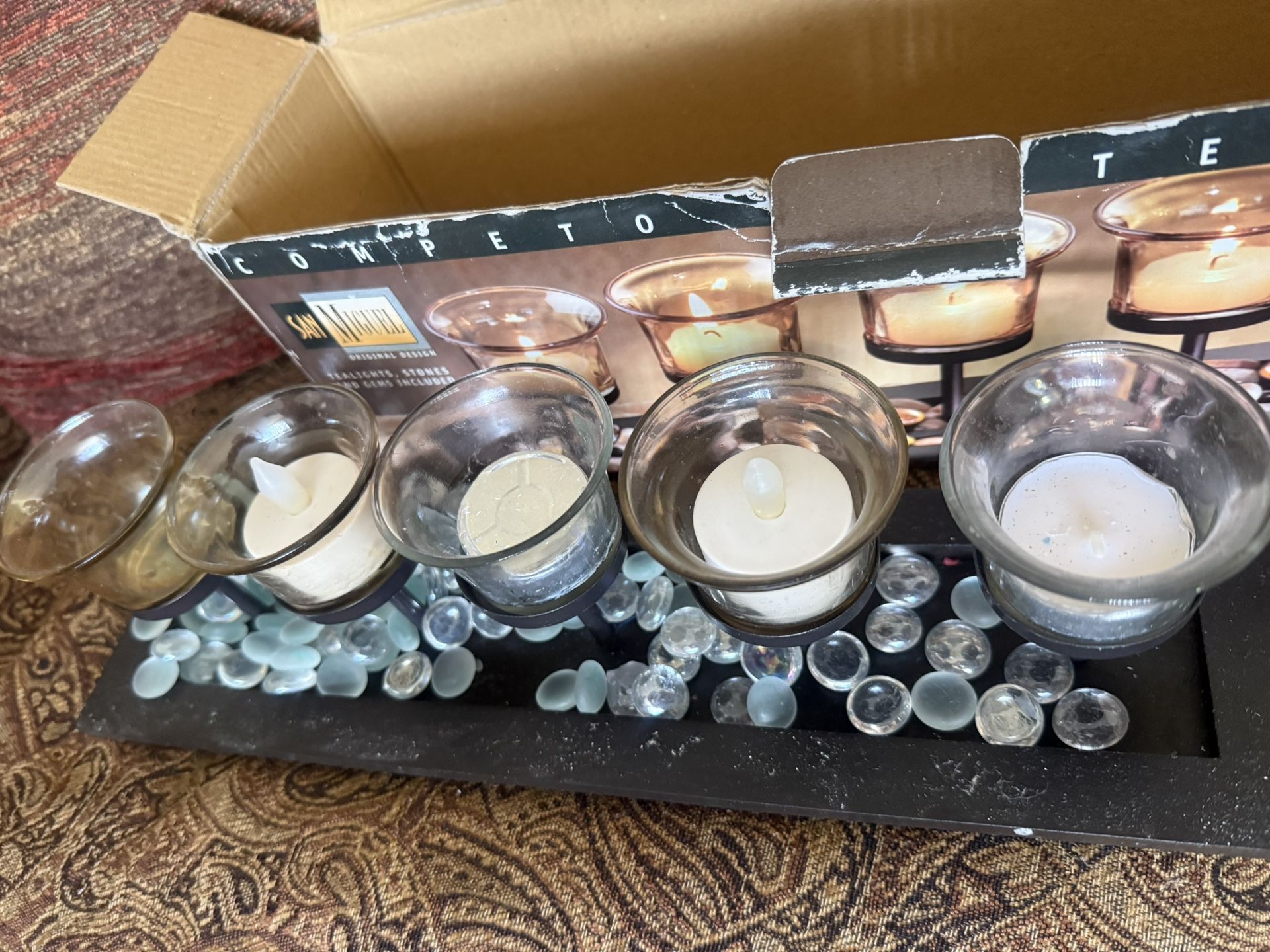 Beautiful table centerpiece or side-bar feature, candle piece with wrought iron frame, glass tea light holders and glass beads in the base. Ambiance, soft candle light.