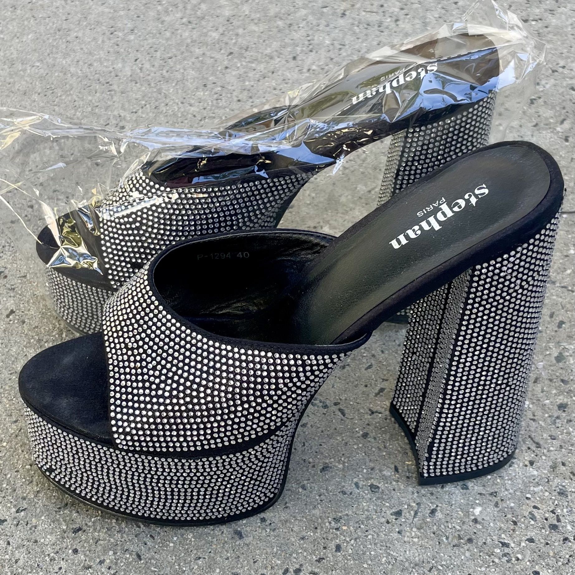 Stephan Paris Rhinestone Platform Mule Heels Black Silver Size 40