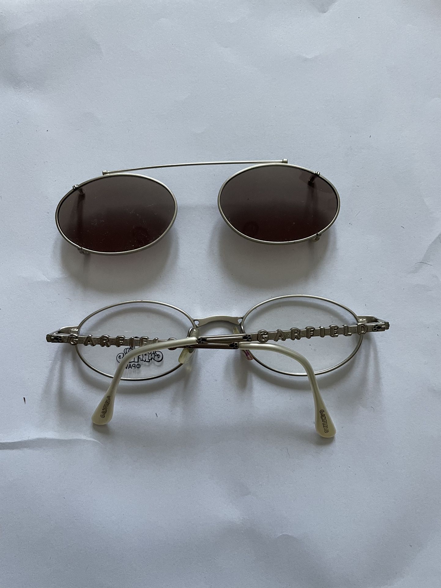 This is a very interesting Garfield-themed pair of glasses, and it is designed to serve two purposes in one. • Frame glasses: It is a pair of oval-shaped metal-framed glasses. The lenses feature a distinct Garfield cartoon image and the "GARFIELD ©PAWS" logo. The most distinctive feature is the spelling of "GARFIELD" engraved on the temples (or the upper part of the frame). • Clip-on glasses: The dark lens next to it is a clip-on sunglass. • You can clip the dark lens onto the original frame glasses, and it instantly transforms from regular glasses into a pair of sunglasses. This is a co-branded pair of glasses.