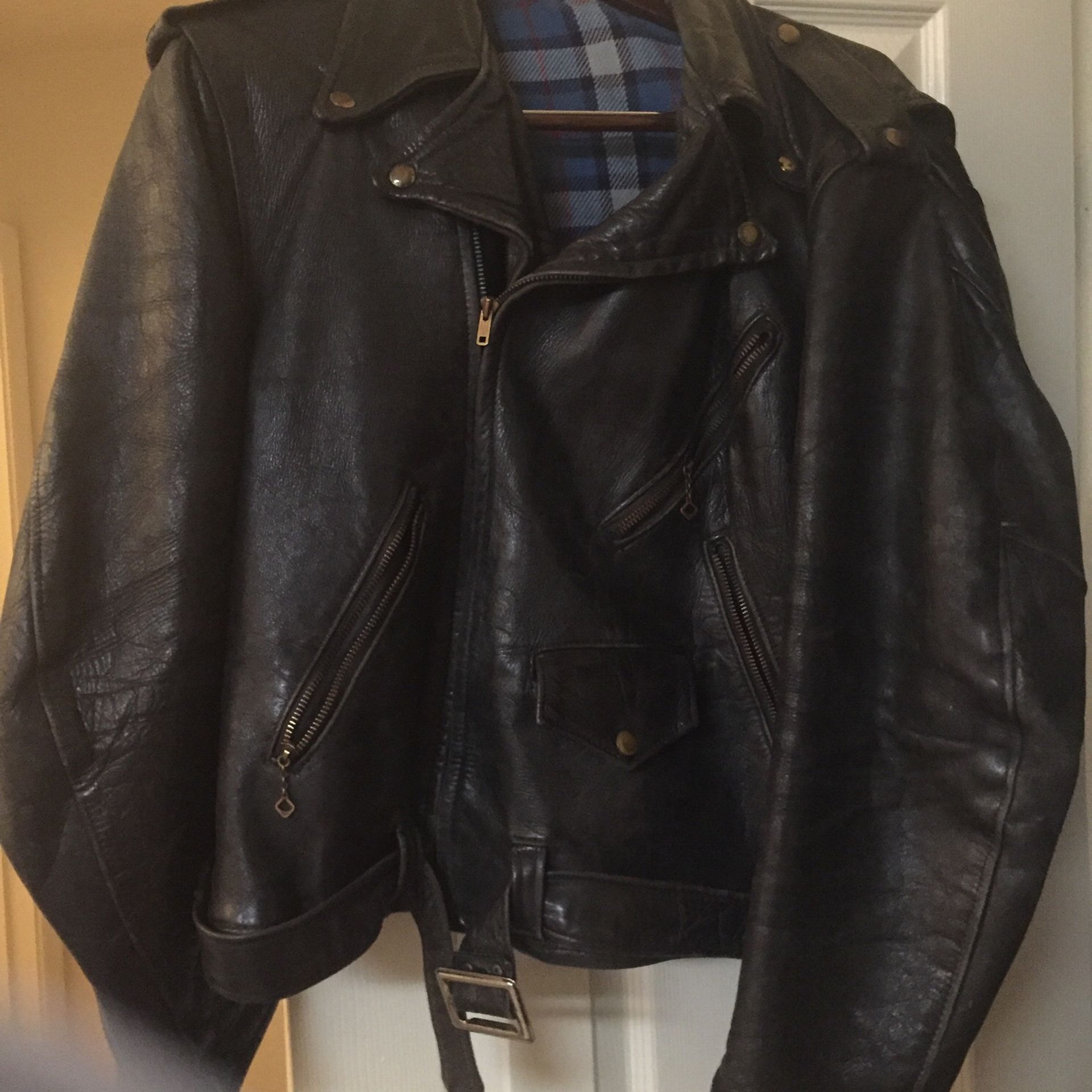 Cowhide motorcycle jacket old school map back pocket key pocket zippers in sleeves re-lined last year size large to extra-large I believe