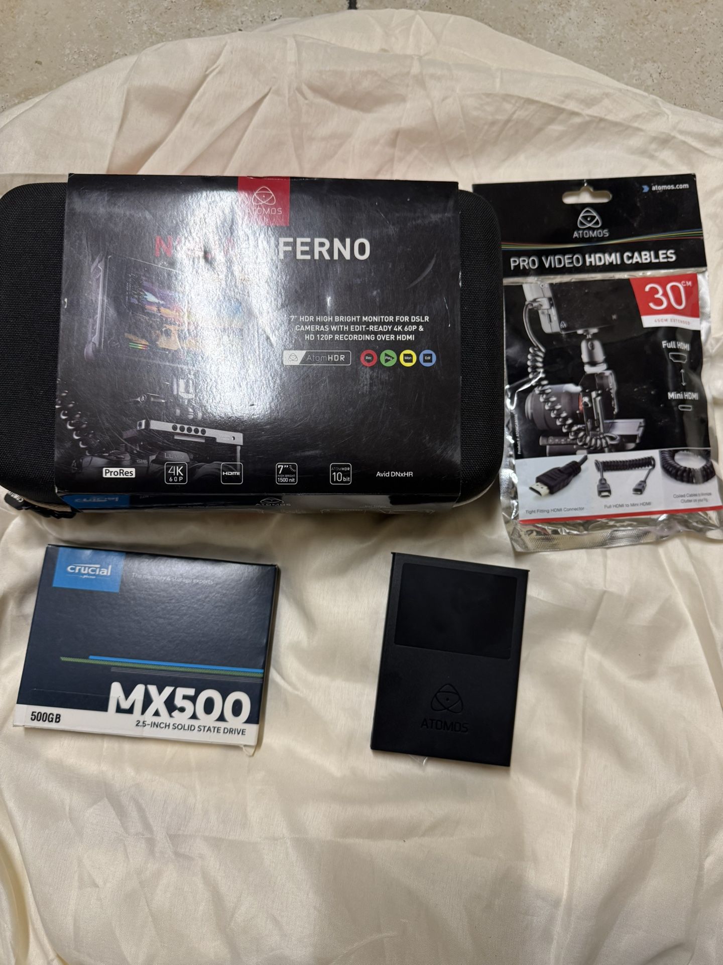 This ad is for a never used Atomos inferno 7” monitor/recorder. Caddy, new 500gb crucial Hdd & new mini to full hdmi cable. Can meet at Starbucks 2190 west Bayshore rd Palo Alto