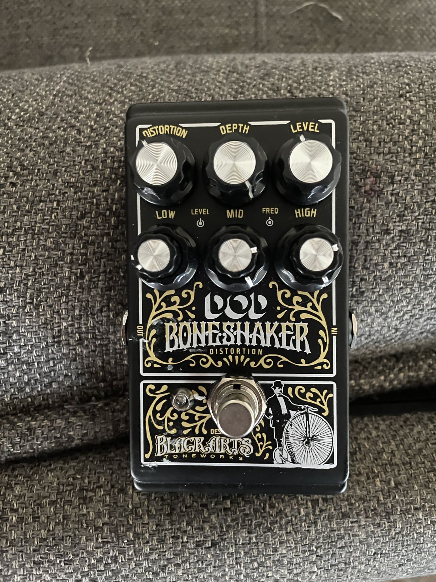 Selling a DOD Boneshaker High Gain Distortion Has not been used live and only for at home practice two times. It’s just too much gain for my liking so I’m selling it. All knobs work well and while it’s a ton of gain it does sound great through the right rig. What makes the pedal unique is the parametric EQ knobs that control tone and wave placement in the signal. I still have the original box that it comes in if you’re interested in that as well