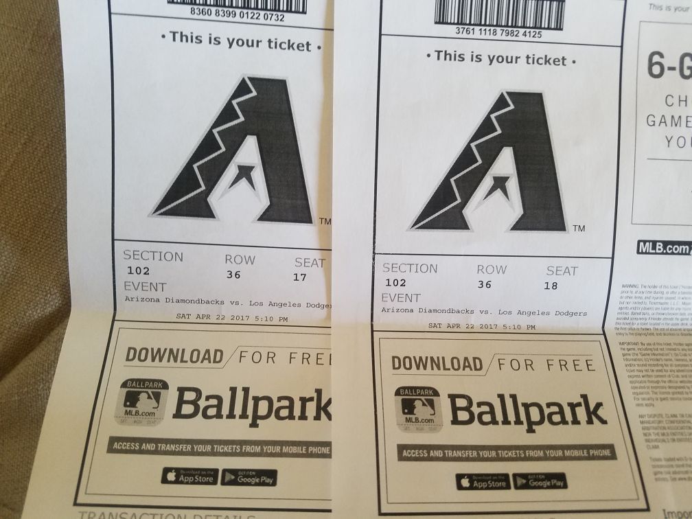 2 tickets to today's game D backs vs Dodgers
