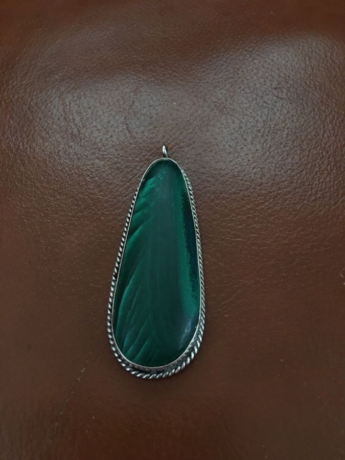 Vintage Sterling Silver pendant with green Malachite stone size 2-1/4 long and 3/4 width is heavy.