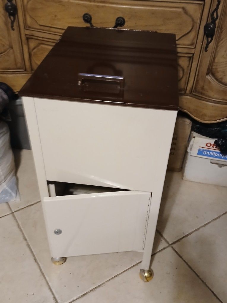 Filing cabinet Opens from the top Plenty of storage space Has wheels Bottom compartment Does not come with the key
