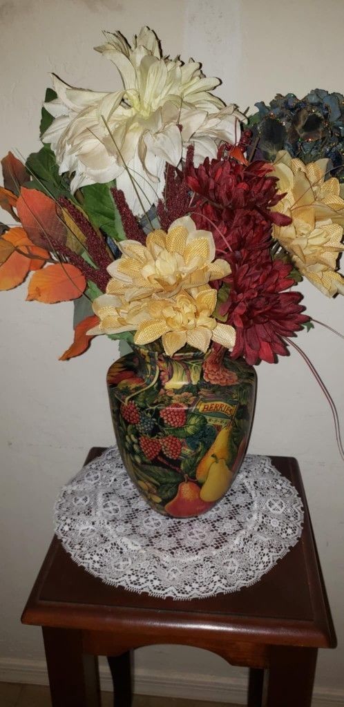 VINTAGE WARM SUMMER COLORS FRUIT FLORAL ARRANGEMENT FLOWER VASE ACCENT TABLE DECOR DISPLAY CENTERPIECE