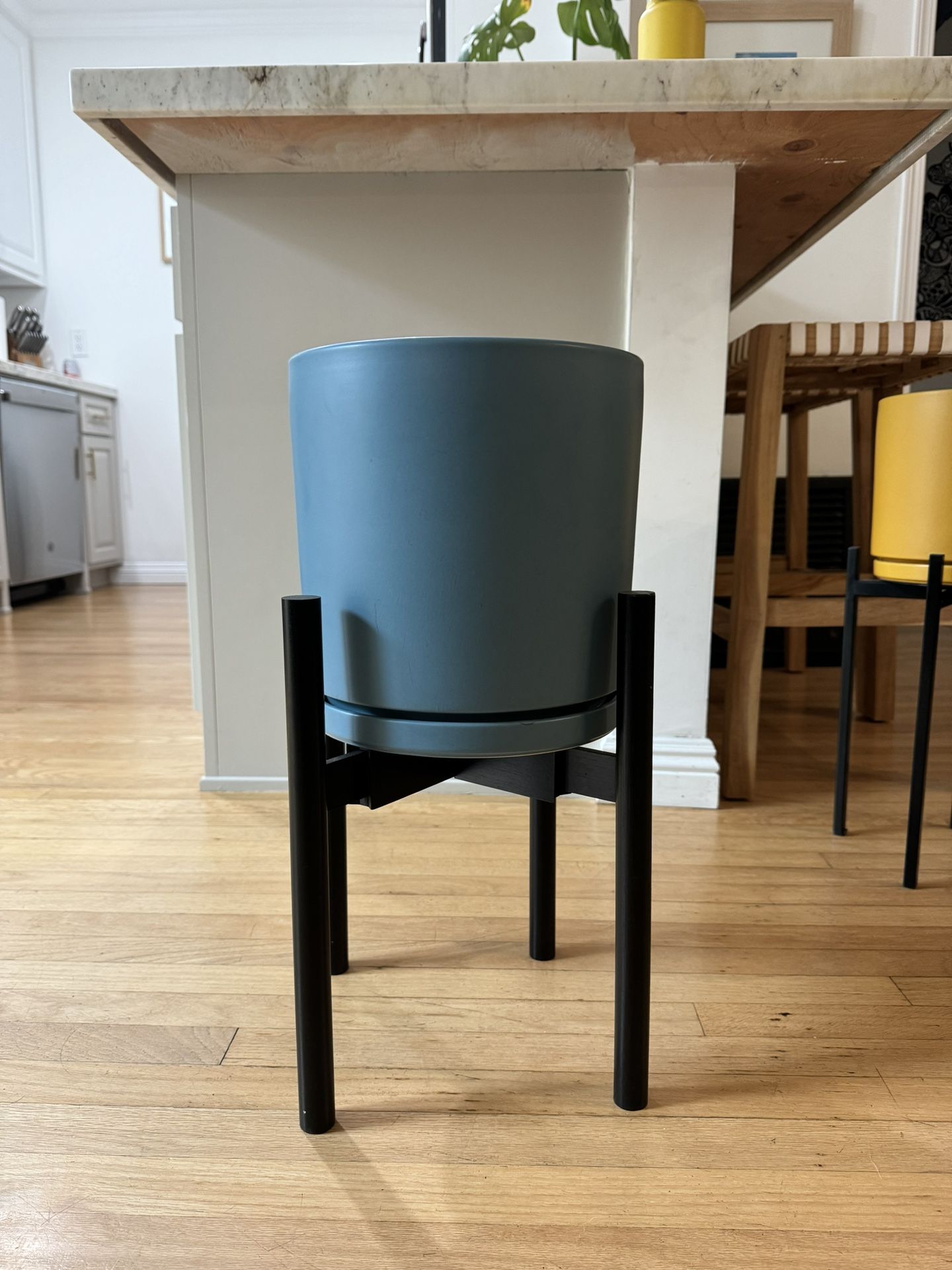 FREE DELIVERY IN LONG BEACH Retail: $105 Asking: $70 Beautiful greyish blue 10” pot with saucer! It comes with an adjustable (height and width) black wooden stand. Modern, clean, and a great pop of color.