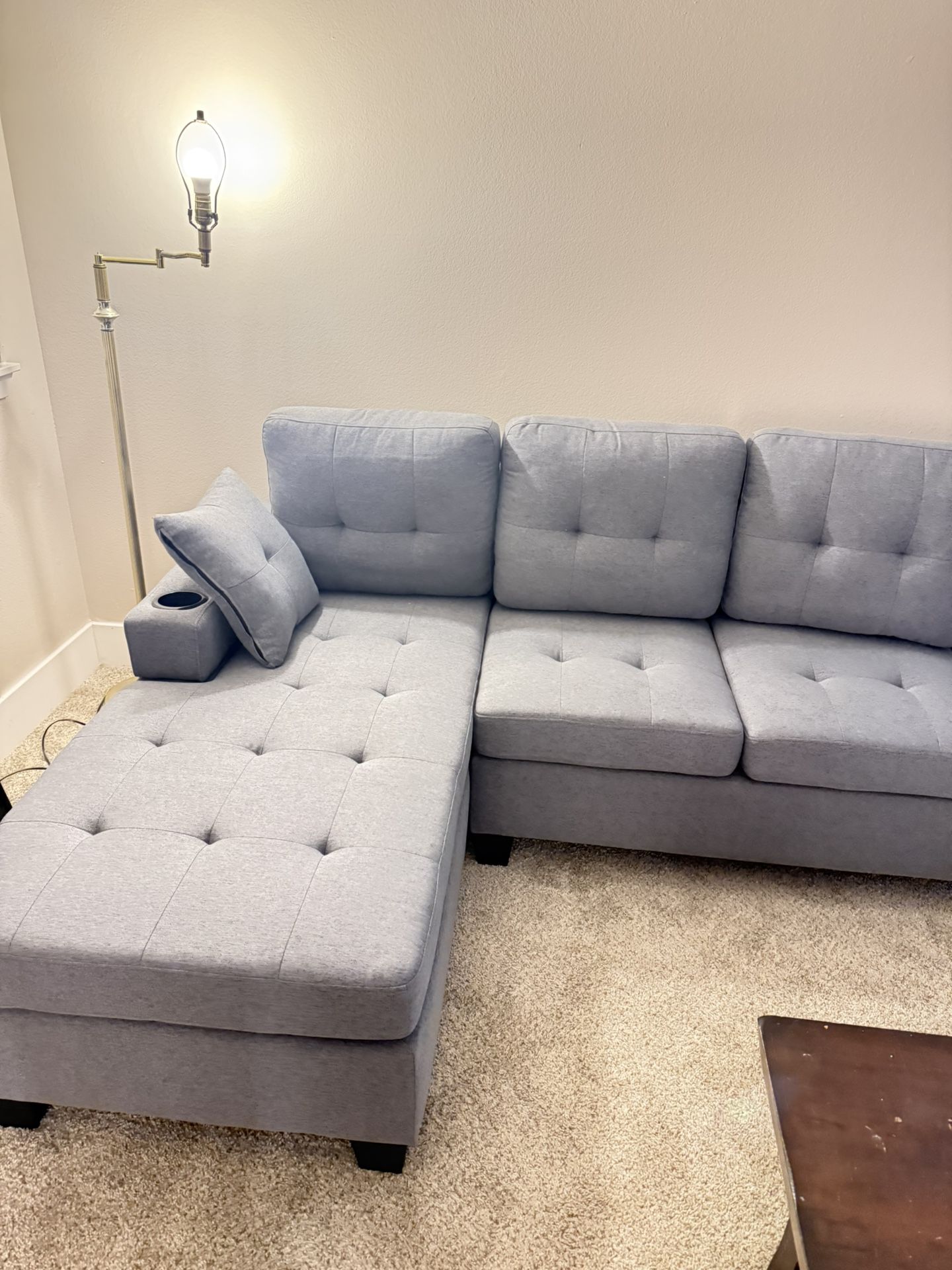 Technically seats 4 with chaise on the right side. It is fabric and cushions are firm. Couch length is 96”, chaise depth is 44”. Brand new, no damage, never used. Put it together and realized it’s just too small/shallow for what I’d like. It would be perfect for an extra living room, a kid’s room or a game room.