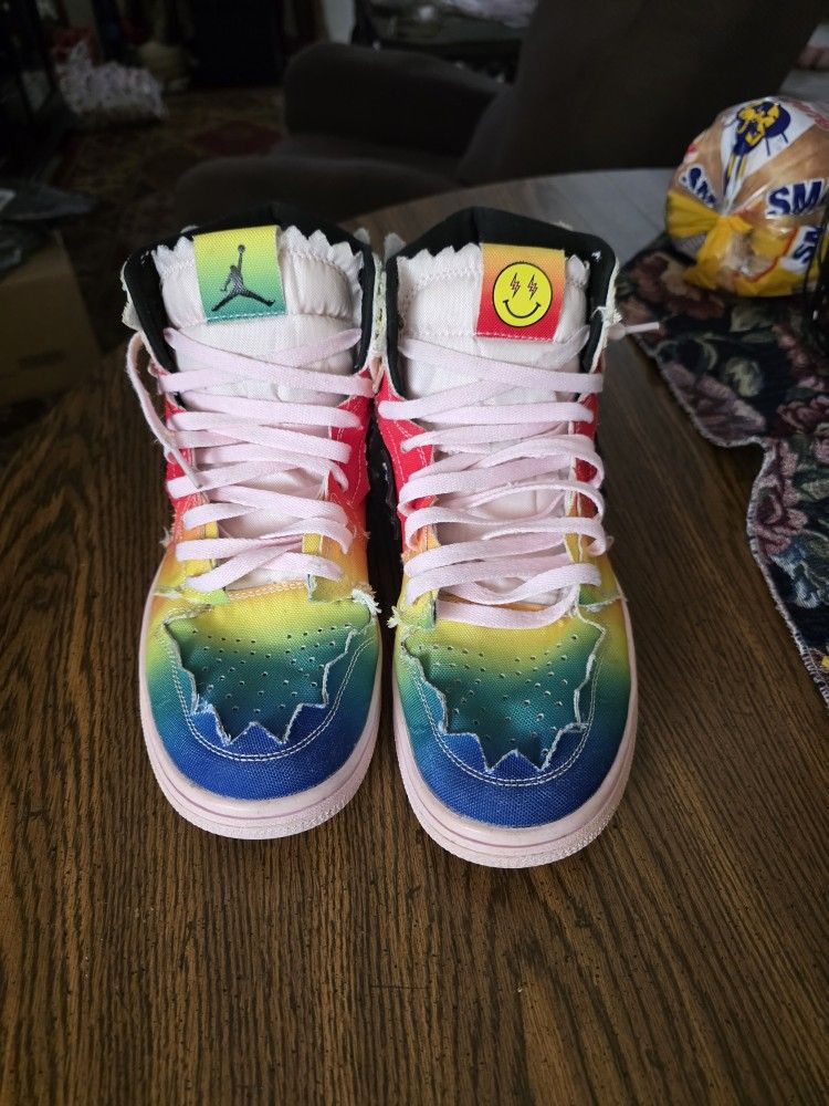 Size 8 - Jordan 1 Retro OG High x J Balvin Tie Dye Pre-owned These shoes Pre-owned sell for up to $700.00 i have seen. I'm asking $250.00 OBO The Air Jordan 1 Retro High OG "J BALVIN" 2020 in size 8 is a vibrant and colorful sneaker designed in collaboration with artist J. Balvin. This high top shoe features a multicolor design with black, pink, and foam accents, perfect for adding a pop of color to any athletic outfit. With a classic Air Jordan 1 silhouette, this shoe combines style and performance for a fashionable and comfortable option for men looking to make a statement.