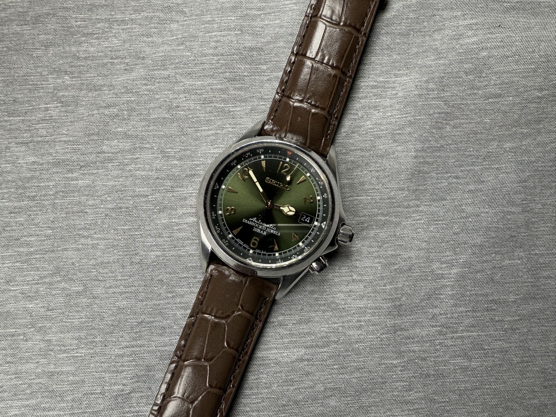 Seiko Alpinist SARB017 Original Box, Papers, and Leather Band Includes aftermarket stainless steel strap Condition: Used (Excellent)