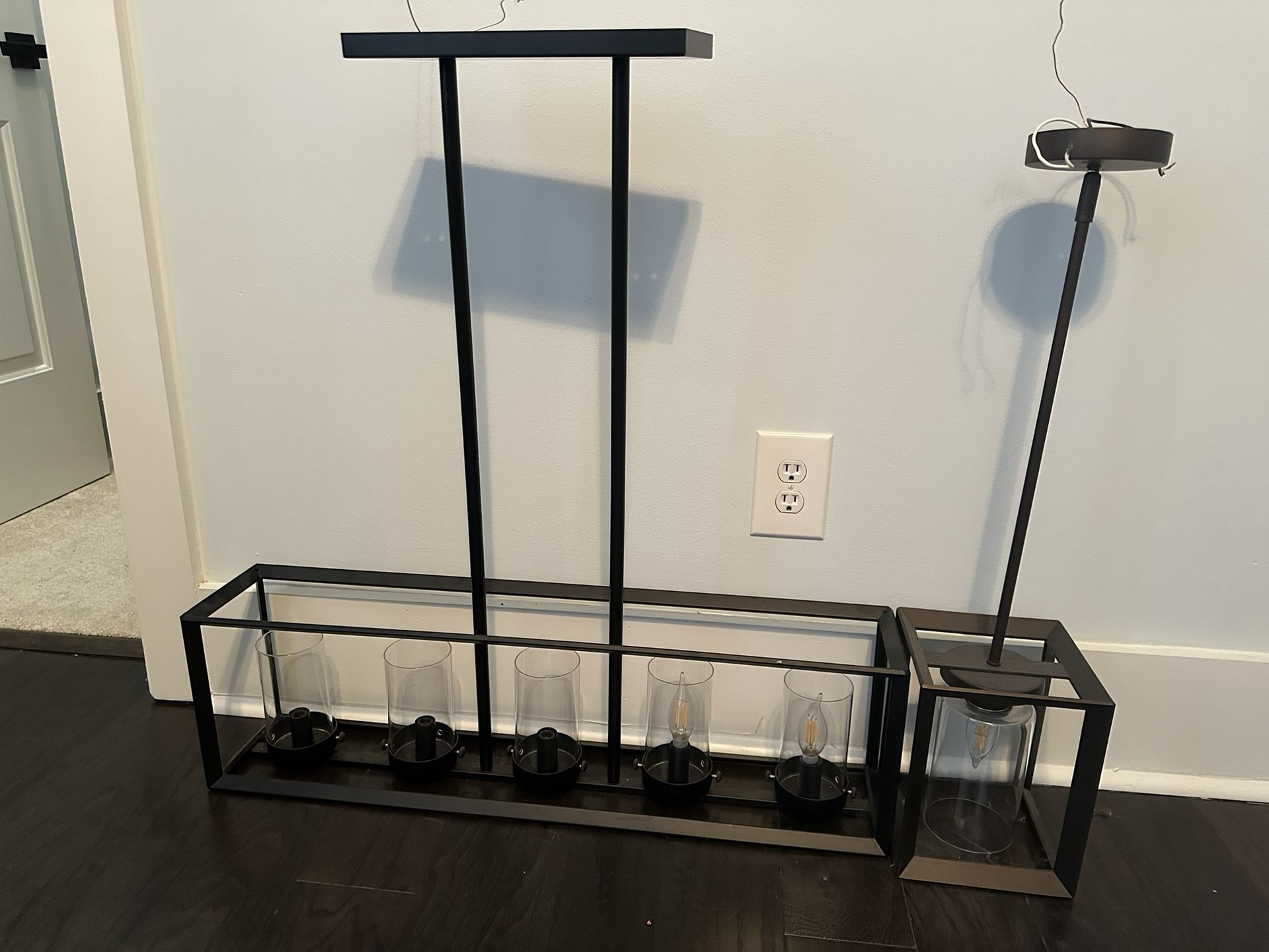 I have two 5-Light Chandeliers. Great for the island and Dining room area. Single light Chandelier. Great for over the kitchen table or wherever looks good! $200 for the set. OBO Can sell separately. Great condition! No longer needed.