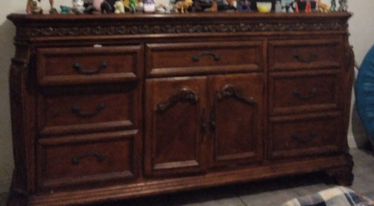 Antique Mahogany Armoire two-piece, three drawers, hand carved solid wood with matching Large Dresser w/ two door centered cabinet. A little dusting and some polish to bring out the Beautiful Mahogany Shine. Solid wood very durable sturdy well made furniture. $275 for the set willing to separate if interested.