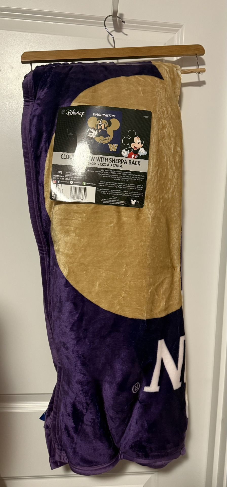 This is a brand new with tags Disney Mickey Mouse University of Washington Cloud Throw Blanket with Sherpa Back. It's 60 x 70 in. It was bought awhile ago and never ended up getting used. Would make a great gift for yourself or someone else! Listed for exactly what I paid ($16 + 8.5% tax) so price is firm. No offers, no trades!