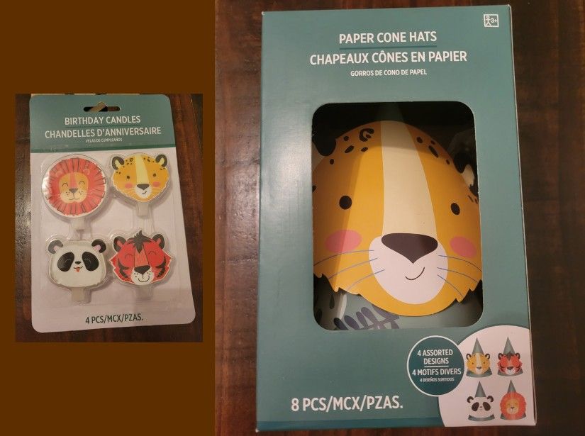 A pack of 4 safari birthday candles and a pack of 8 paper cone hats. Both for $6