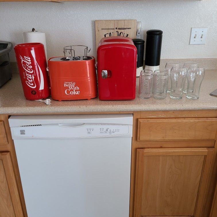 Toaster, little fridge and a can holder I believe the cylinder thing is. Good for a coke collector. Also 4 mini glasses and 4 regular glasses.