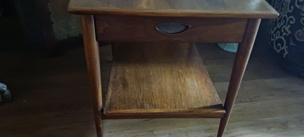 This table is approximately 28" x 23" and 23" tall. There's a single drawer that runs the length of the table. There's also a single shelf. This is a Mid-century Heritage Henredon table the price is firm.