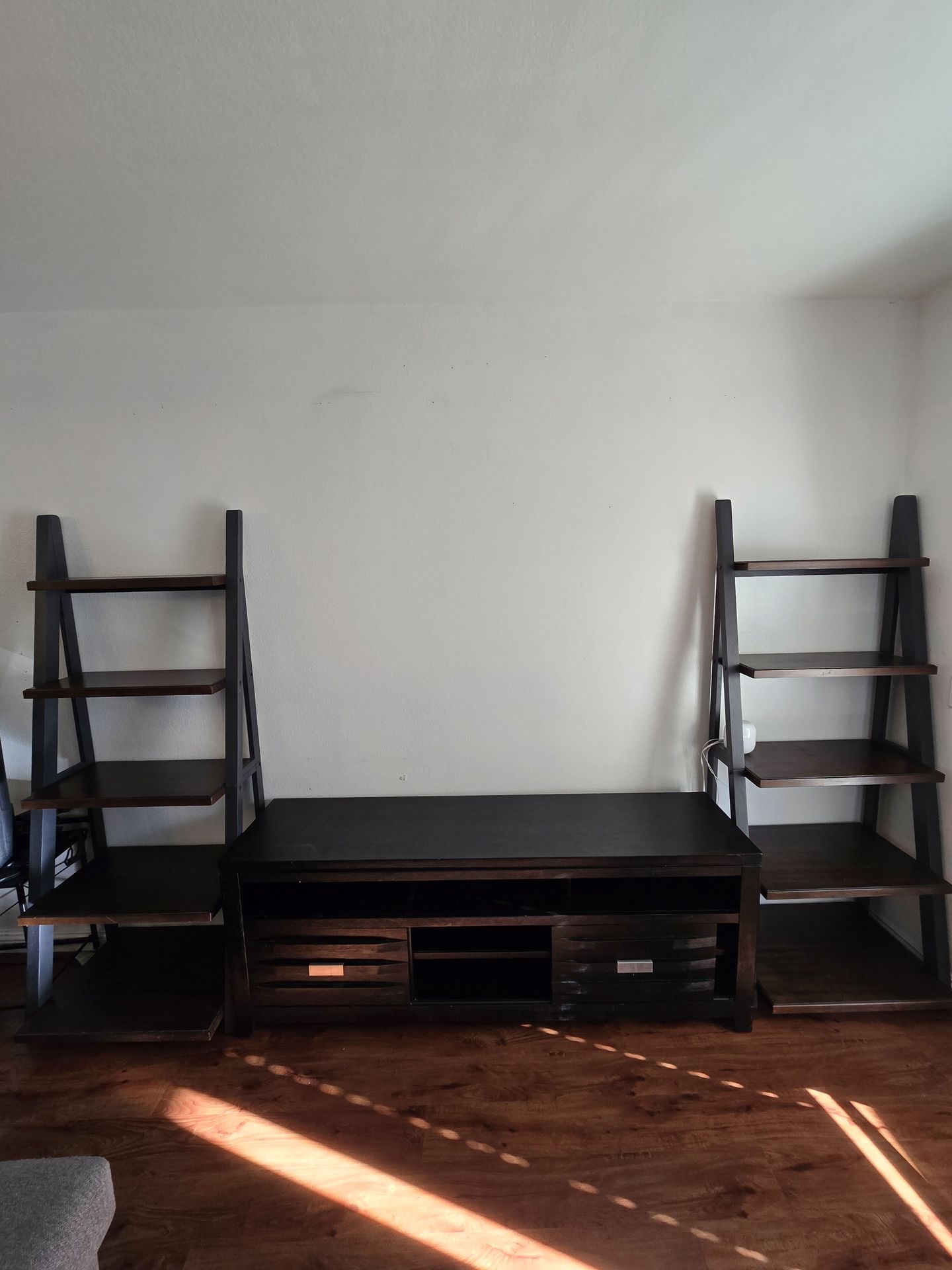 Moving out Sale Costco ladder book shelves $100 each in great condition Colors : Dark Gary with Dark Brown Tv console $500 OBO Great condition Color: Black wood Brand new $750+