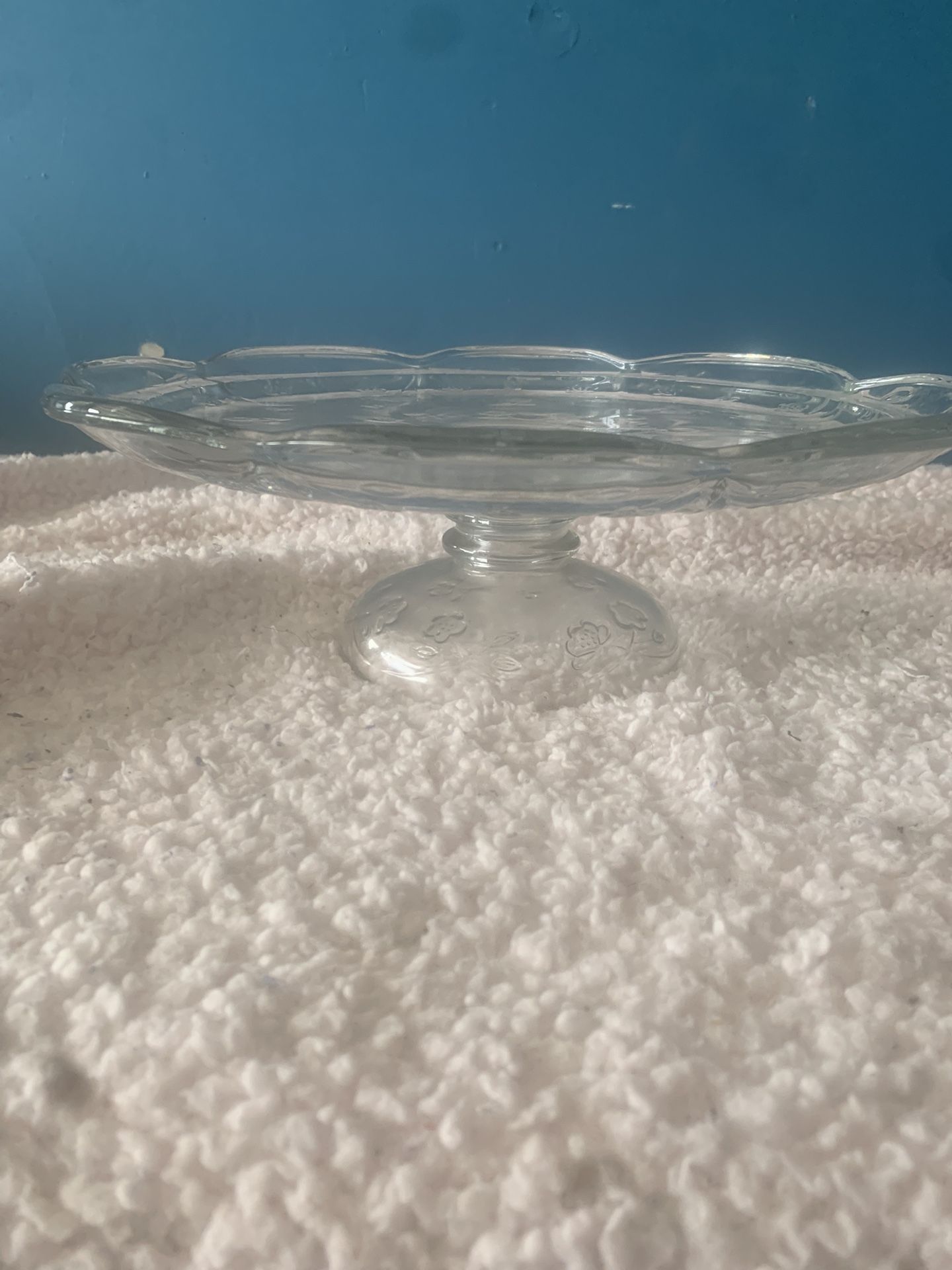 Used for serving cakes and pastries and can also be used as a rotating platform for decorating cakes. This cake stand is made of clear glass and features a floral design on the base.