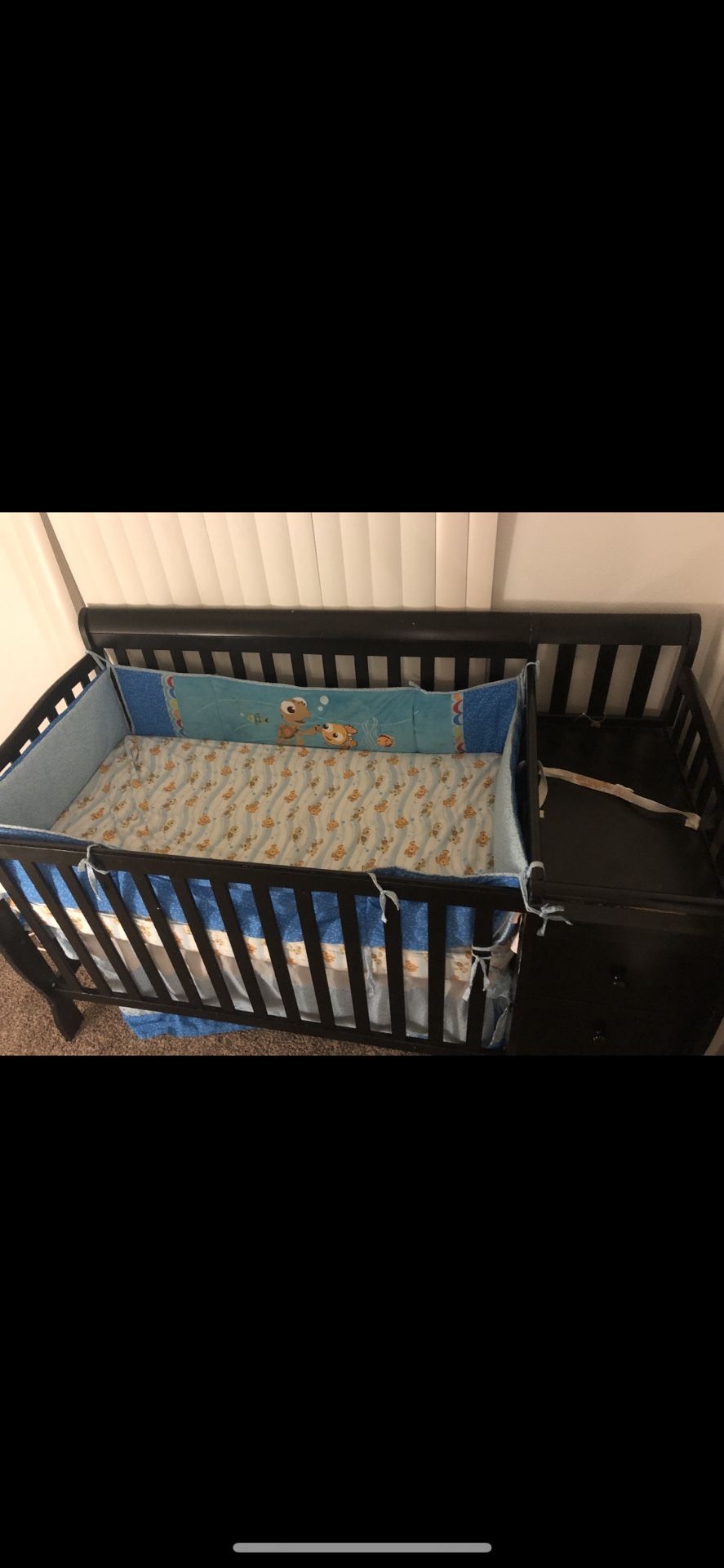 Baby crib comes with bed and Nemo bed set mid condition.. It has 3 droors for clothes and 3 shelves on the side. It also has a changing table.. I got for $550 2 years ago so firm on price!