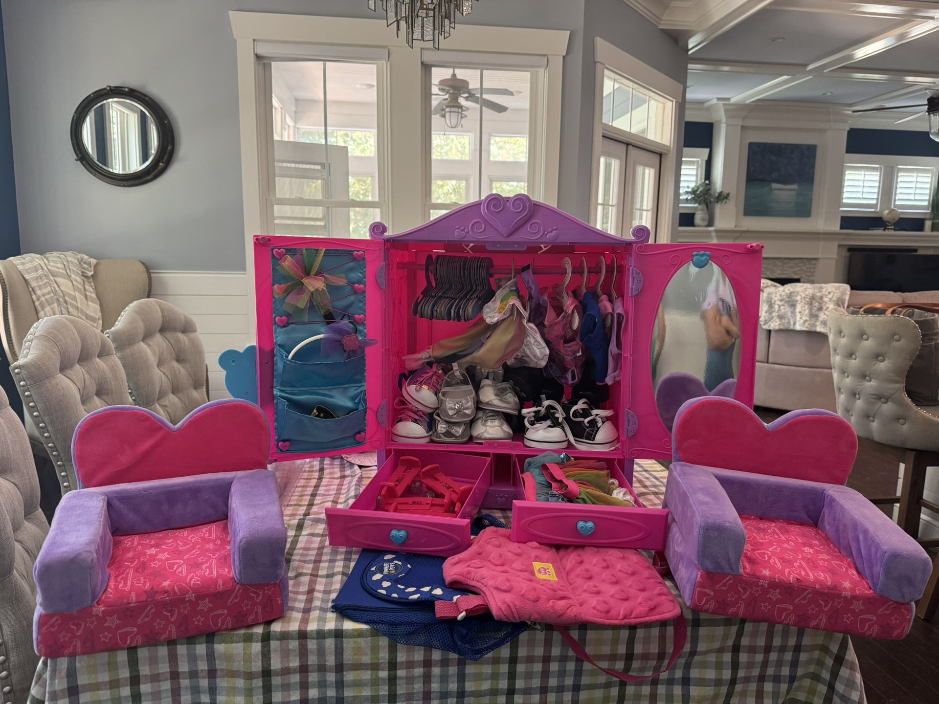 We are selling this build a bear closet set with the below items included. More pictures upon request. Used, in excellent condition. No plans to split it up. Comes all together. BAB Closet Multiple hangers 2 pairs of skates 2 skirts Pair of BAB undergarment in white 2 capes 1 dress 3 shirts 2 pairs patent boots 1 pair leather boots 5 pairs of sneakers 1 pair of dress up heels 2 couches that turn into beds A few hair accessories 1 pet carry 1 BAB carrier back pack $100