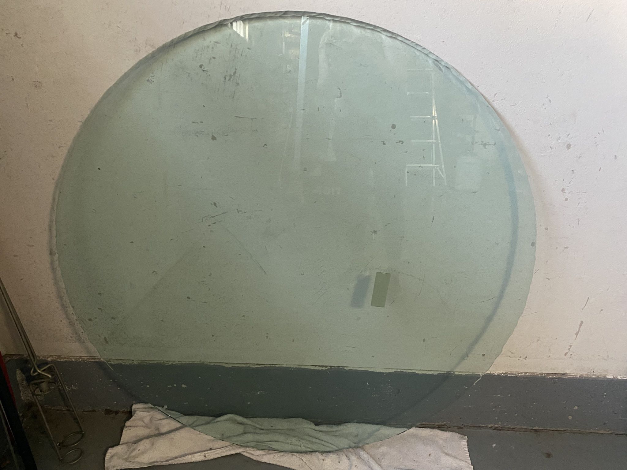 This is a custom brand new piece of glass ( the photo looks like it’s dirty but it’s just showing my garage wall behind it)- still has the sticker on it The edge is an expensive custom edge It’s 1” thick glass