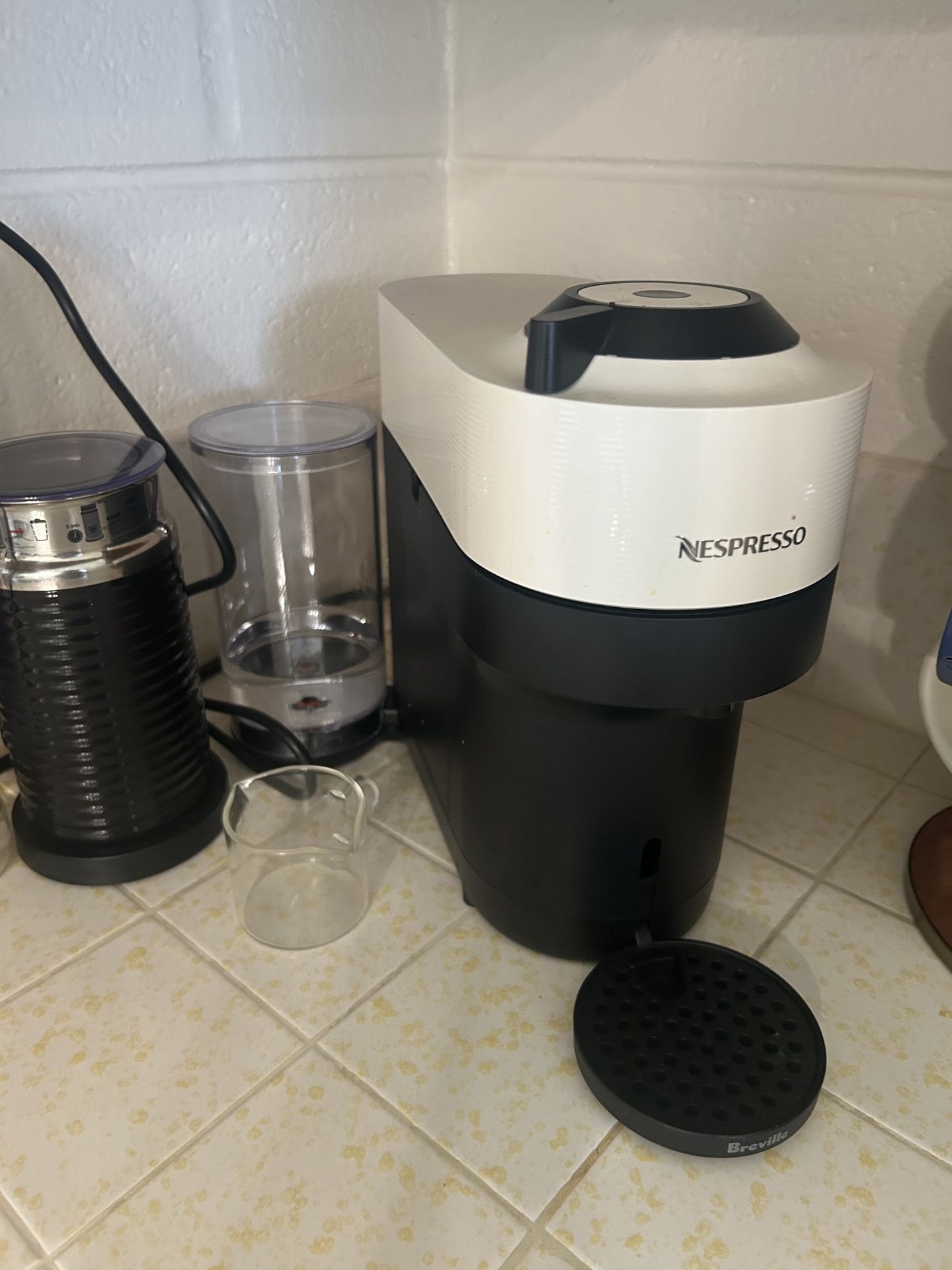 Nespresso Vertuo Pop+ machine with milk frother. Color is coconut white. Lightly used. Will come with 15 mixed pods of espresso already.