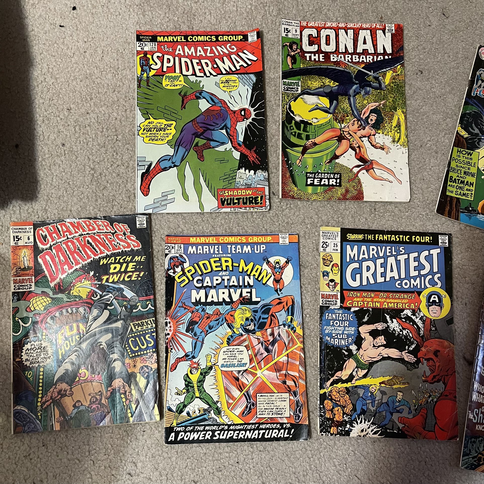 Spider-man and the savage sub-mariner (Vol. 1 number 14 Oct 1973) Batman (Vol. 34 Number 253 Nov. 1973) Marvels Greatest Comics - Iron man, Doctor Strange, and the star spangled captain America - Starring the fantastic four (Vol. 1 number 25 feb 1970) Marvel Team up Spider-man and captain marvel (vol. 1 number 16 December 1973) -m Chamber of Darkness watch me die twice (vol 1 number 6 august 1970) The amazing spider-man the shadow of the vulture (vol. 1 number 128 Jan 1974) Conan the barbarian the garden of fear (vol 1 number 9 sept 1971) Detective comics Batman and Robin (no 386 April 1969) The invincible Iton Man the slave of Lucifer (vol. 1 number 20 dec 1969) Marvel tales starring Spider-man the madness of mysterio (vol 1 number 49 feb 1974) $250