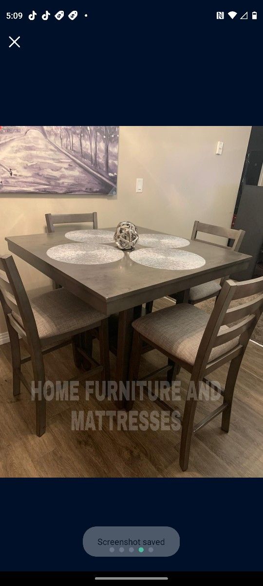 Pub table 40" x 40" with 4 High chairs Includes shelf on the bottom. Solid wood grey. Brand new in box 📦 5 pieces. Payment plan option $0 down No credit needed. No interest. Delivery and assembly available 🚚