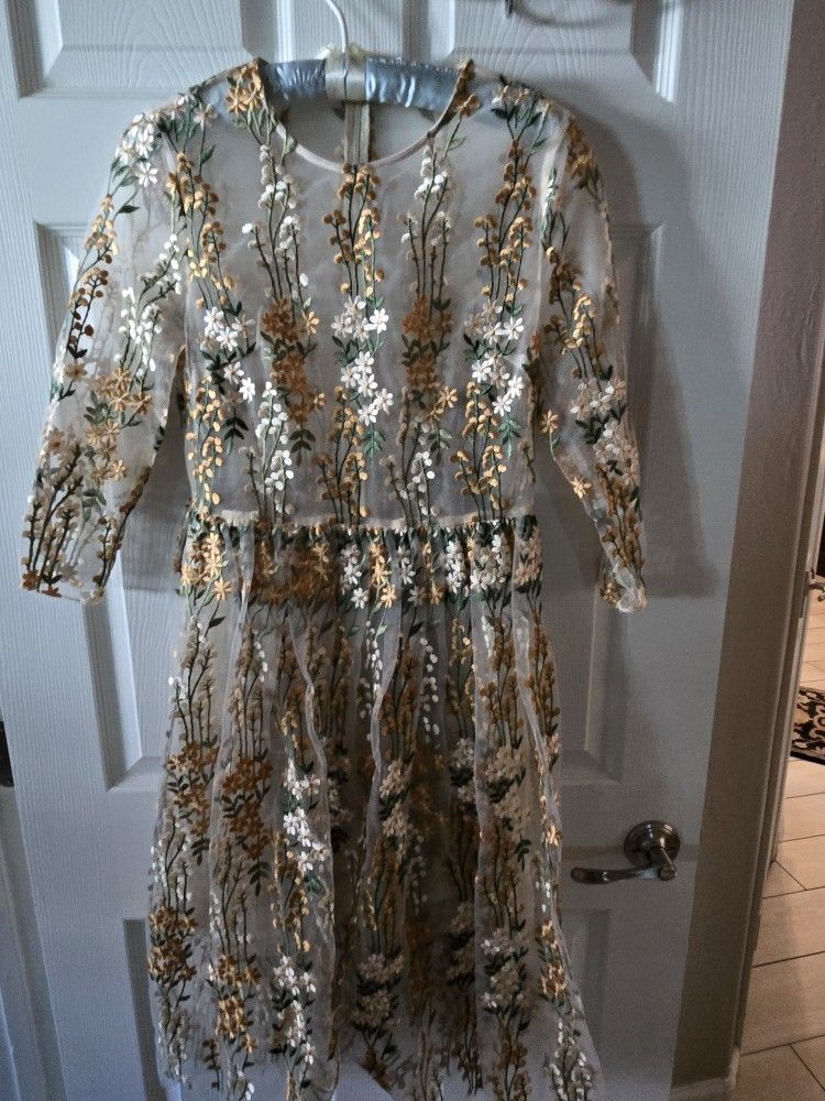 Size small to medium..beautiful spring embroidery of flowers..see through but does have lowers lining..Retro and so adorable! Won't disappoint!