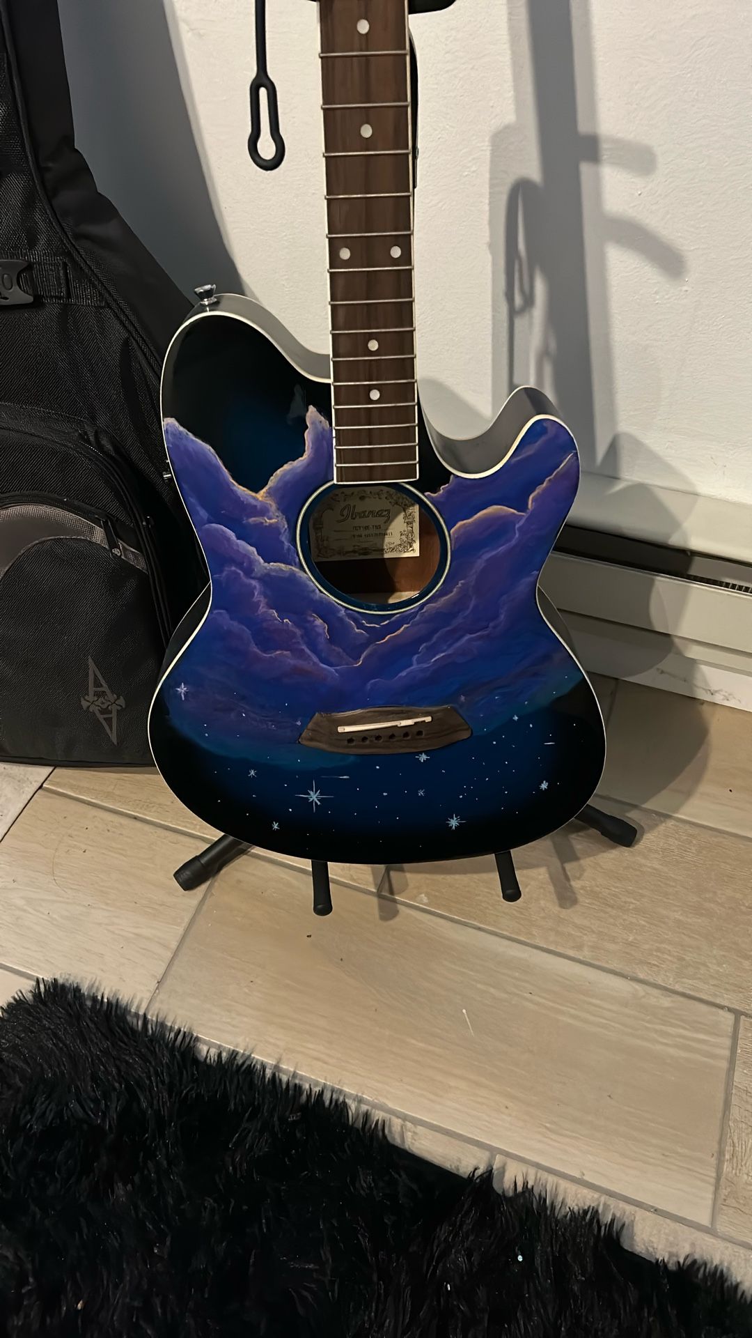 Six-string guitar (needs new strings), guitar case, and guitar stand. Guitar has custom art on front.