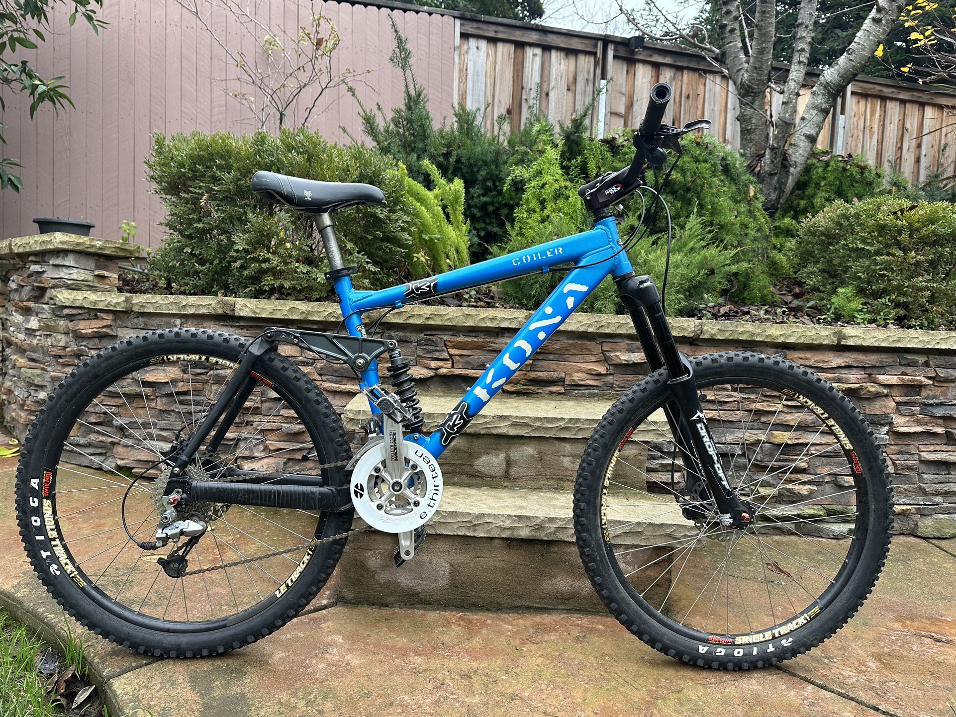 Kona Coiler Front & Rear Suspension Bike comes in used/normal wear condition. Rides smooth and looks great with some minor marks/scratches. Frame Size: 17” Wheel Size: 26” Colors: Matte Blue/Black/White Bike Type: Mountain bike, front & rear suspension Weight: 32.9 MSRP: $1,600 Frame & Fork: Frame Construction: TIG-welded Frame Material: 7005 aluminum Fork: Marzocchi Drop-Off, 150mm travel Fork Materal: Aluminum, single crown Rear Shock: Fox Vanilla R Components: Component Group: Mountain Mix Brakeset: Hayes HFX-9 XC brakes, Hayes HFX-9 XC levers Shift Levers: Shimano Deore RapidFire Front Derailleur: Shimano Deore, top-pull Rear Derailleur: Shimano Deore LX SGS Crankset: Race Face Ride XC ISIS, 22/32/44 teeth Pedals: Shimano PD-M505 SPD Bottom Bracket: Race Face SRX ISIS Rear Cogs: 9-speed, 11 - 32 teeth Chain: Shimano CN-HG93, 1/2 x 3/32" Seatpost: TruVativ XR Dual Clamp Saddle: WTB Speed V Comp Handlebars: TruVativ XR OS riser Handlebar Stem: TruVativ XR OS Headset: 1 1/8" threadless Tien Hsin Big Nut Wheels: Wheel Size: 26" wheels Hubs-Front: KK Disc, Rear: Shimano FH-M475 disc Rims: Sun Rims Single Track, 32-hole Front Tire: 26 x 2.30" Tioga Blue Dragon Spoke Brand: Stainless steel, 14ga. (2.0mm) straight gauge Spoke Nipples: Brass nipples