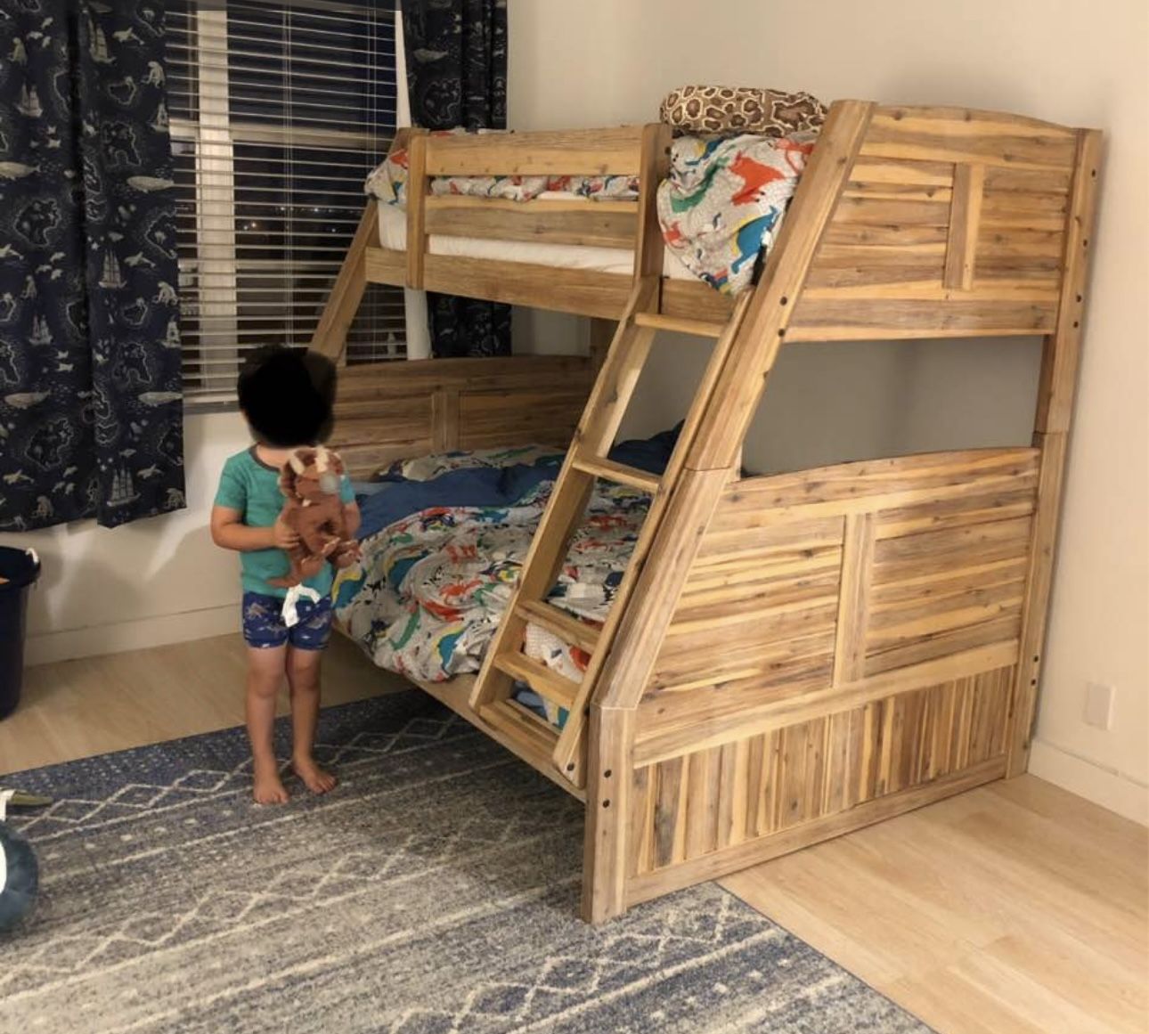Beautiful wood bunk bed in great condition Full size bottom, twin size top Purchased for $1200 Selling for $500 with full mattress included