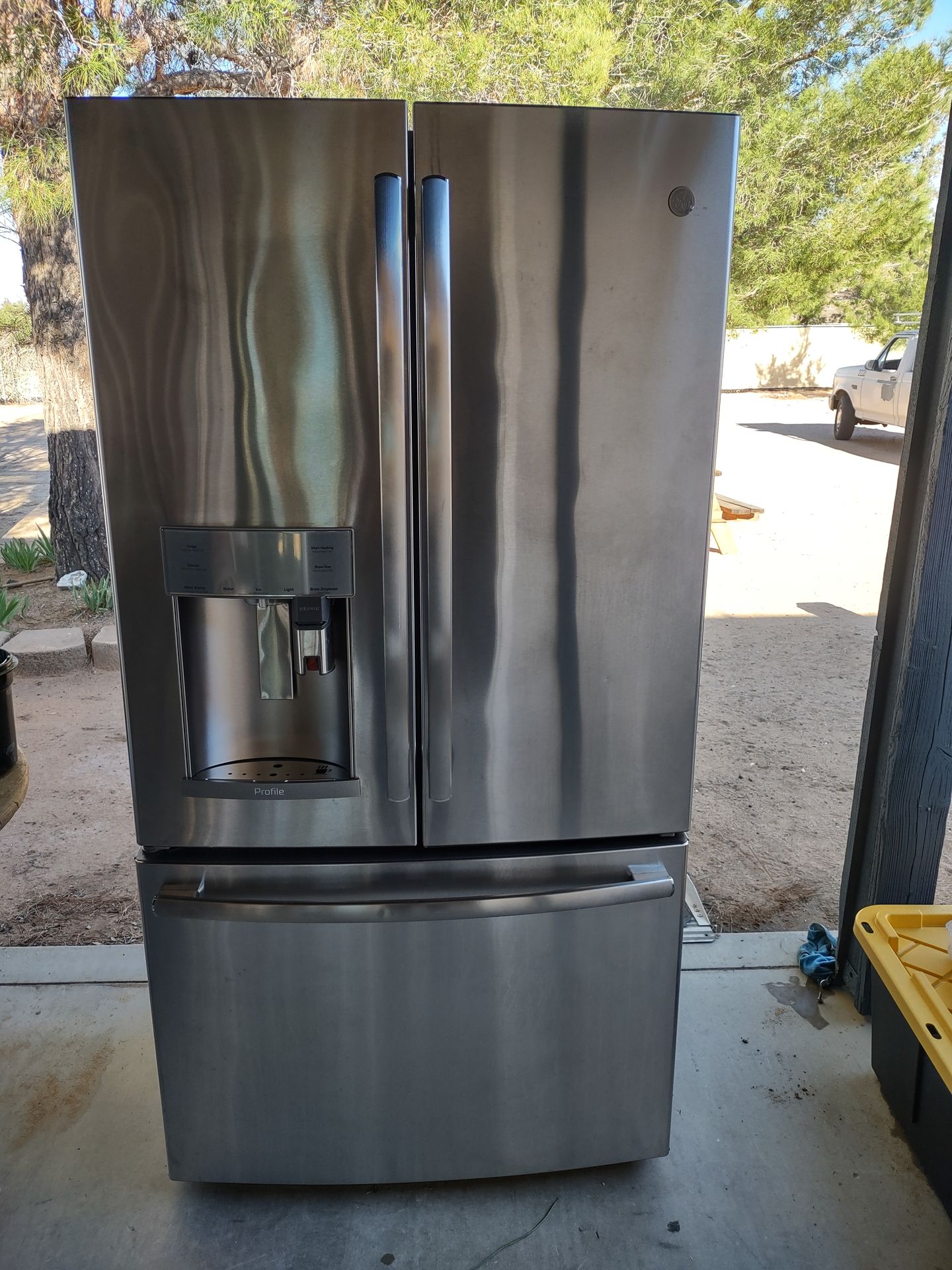 GE Keurig cafe french doors counter depth refrigerator with ice maker and water dispenser( both hot and cold water) all in working order and well maintained. The fridge measures 36 inches wide by 69 tall and 27 deep. It features custom cool design, easy water filter access, adjustable shelves and doors bins, energy star π clean inside and out. Ready for use. No trades, no holds, no low ballers. Serious buyers only .